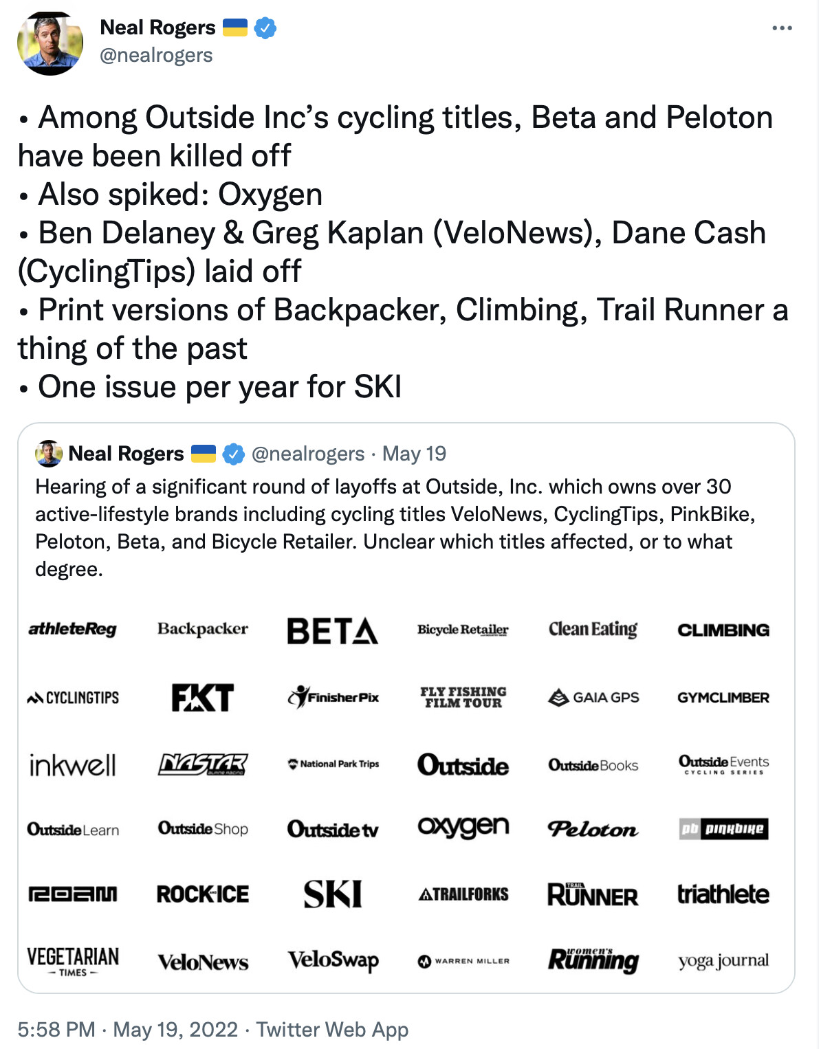 But seriously who thought it was a good idea to go big on FKTs, or 3 mainstream roadie magazines. Talk about way too niche for a big brand like Outside. Meanwhile BQ is just rolling along