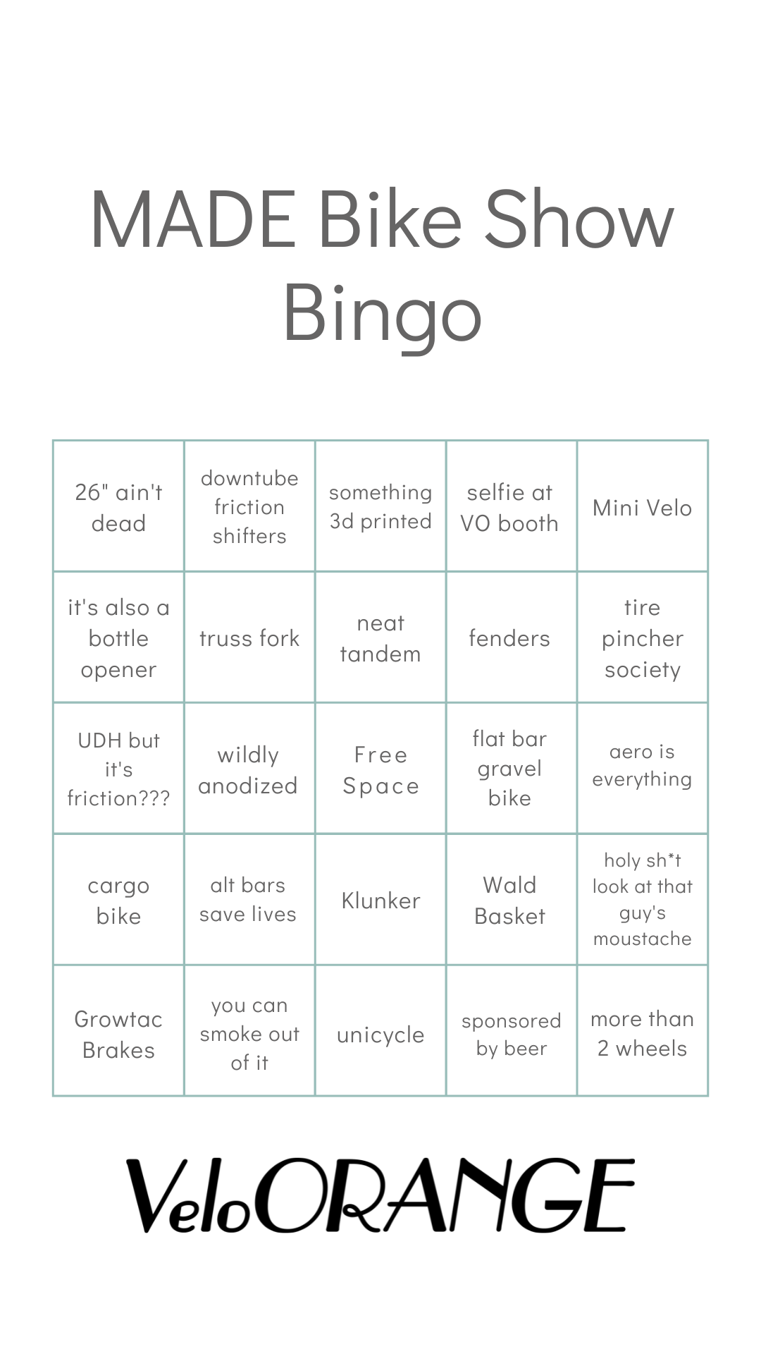 Anyone going to MADE? We’ll be there with an unannounced new prototype frameset. We also made a bingo card. Per the blog post (See You at Made! – Velo Orange), the first person to bring us their completed bingo card and photographic evidence (take pics of each box completed) will get a $100 VO gift certificate and VO t-shirt.