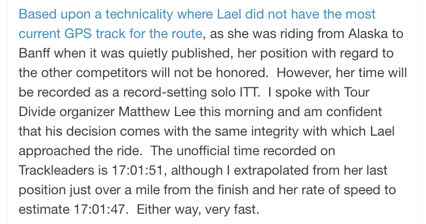 I think you can get Dâqed alright. Lael has been Dqed multiple times for not following the course. The only real results are on trackleaders.com and I donât know if itâs possible to change what that says, after the event. I started watching Josh Ibbots movie the other day, but only got a few mins into it. He was the guy Lael alluded to wrt another film crew at the same time she was riding.