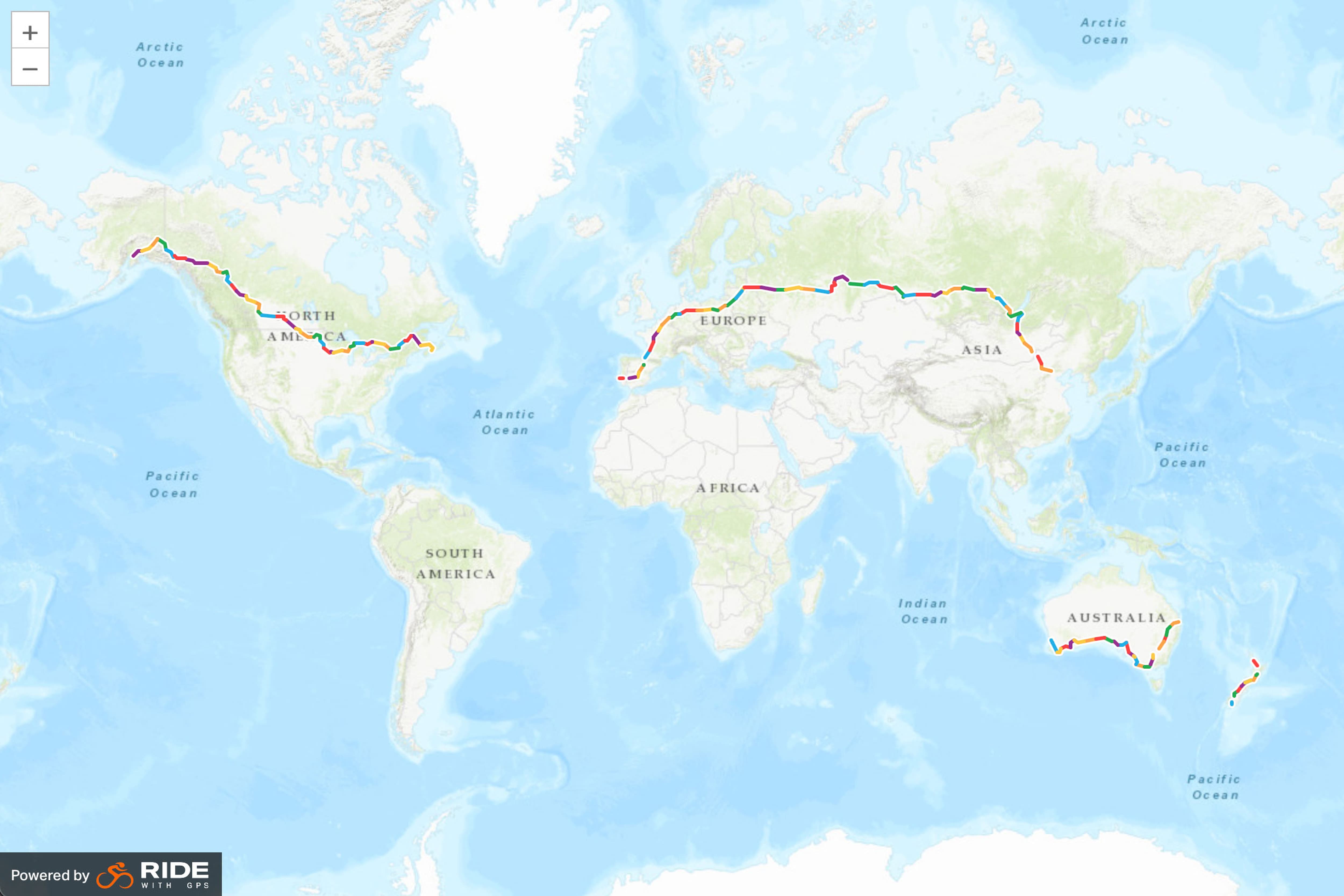 Resurrecting this thread for a DQ. Lael is riding Jenny Graham’s around the world route in an attempt to beat the record. Cool as hell. Looking at the routes, though, it appears that Lael omits an entire continent (Asia) and takes drastically different paths through North America and Europe. In spite of this, it looks as though the distance is the same (~18,000 miles). That said, the logistical challenges of sticking to English-speaking/English-speaking adjacent countries are very different than traversing all of Asia. Anyone know what’s up with how the route can be so different but the ‘record’ can be the same? Doesn’t diminish anything from the effort atmo, but its interesting to me that it could be considered the same ride. I know with things like RAAM and the Divide there are minor route changes year to year, but this seems a lot more significant than that.