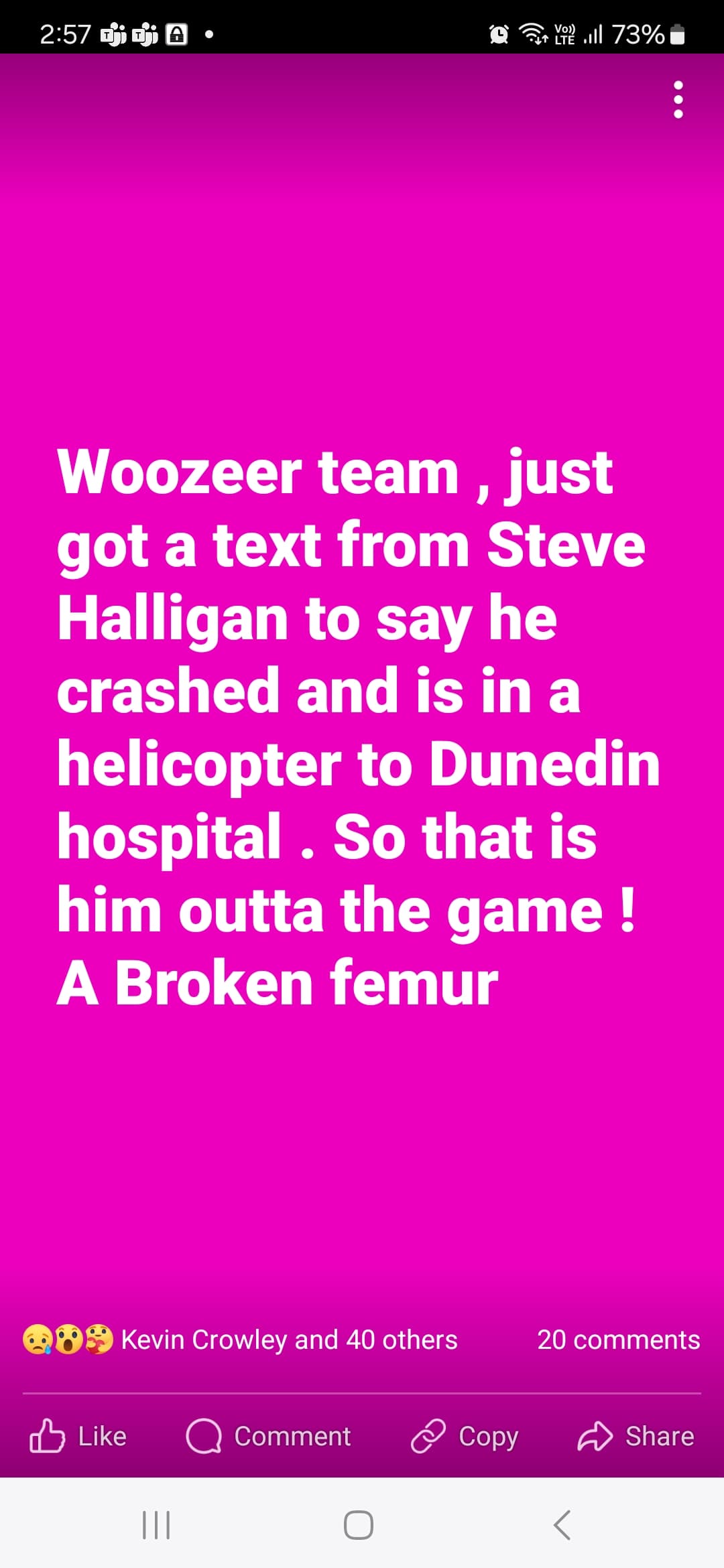 I texted Steve yesterday as he lay in his hospital bed. Apparently he lay on the ground for an hour before activating the SOS on his tracker. 3 hours later he was in hospital but his food had only just arrived. I can magine how hungry he must have been. They are operating today. Maybe a plate, the break is high up the bone.