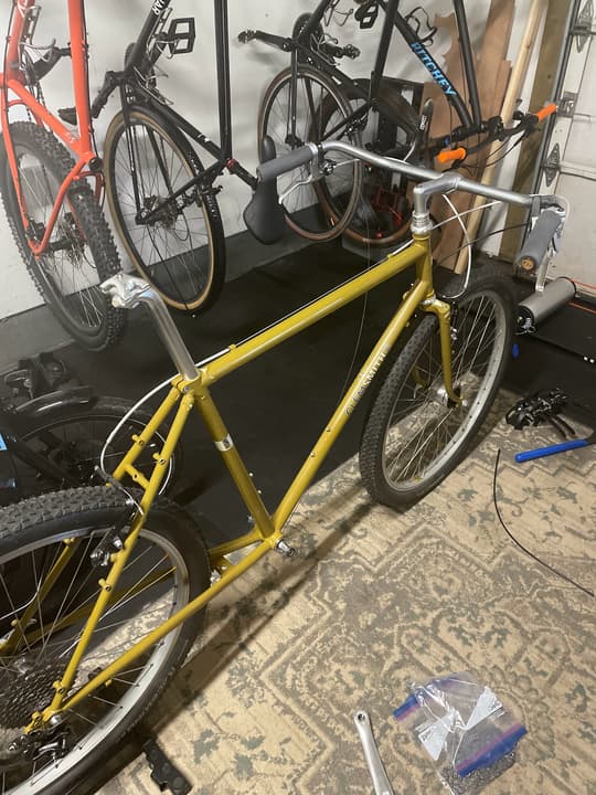 $0 Bridgestone with a mix of old and new parts thrown at it. I had some 2.25â WTB Trailboss tires that rubbed the CS on both sides so back to the SB8s as god and John Tomac intended.
