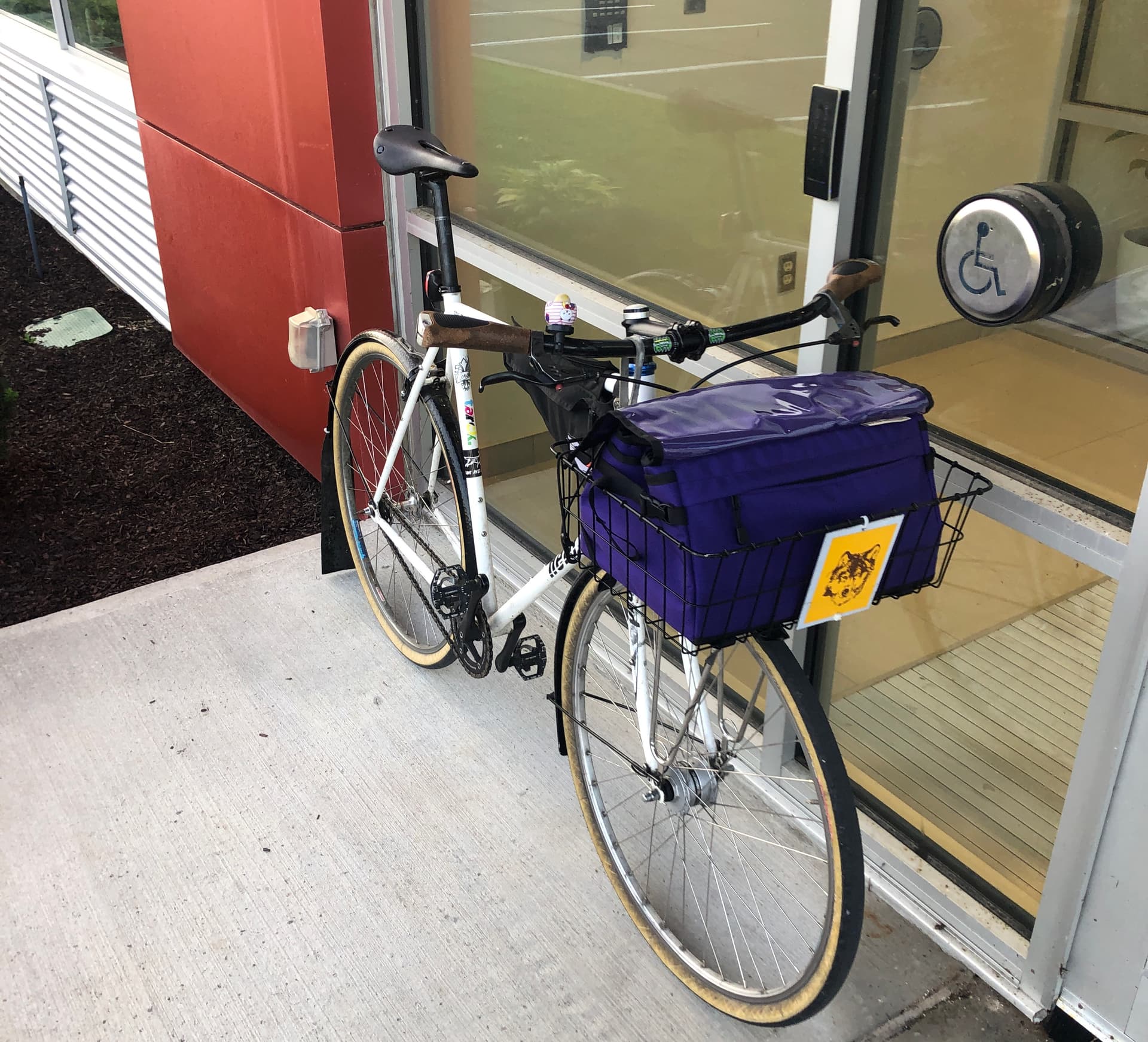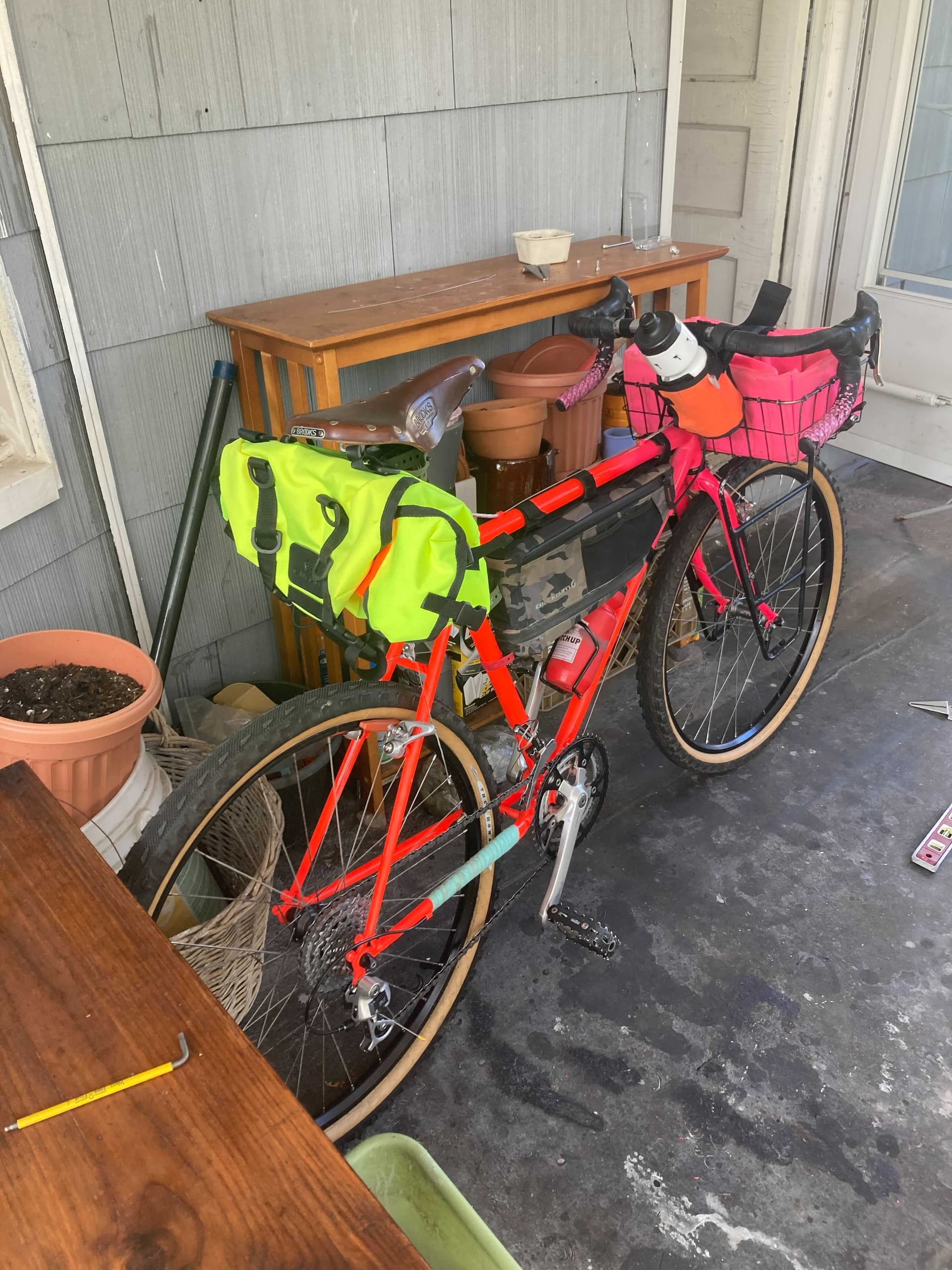I have been told to post bike on tarck – a bike so dumb only the deepest recesses of my mind could think it up. A lot of futzing left to go (new bar tape, wear off enough of the brake track ano to get it to stop squeaking, find a new straddle cable yoke for the front, maybe see if I can drop my water bottle mounts some) but did a test fit on the bags and things seem ok!