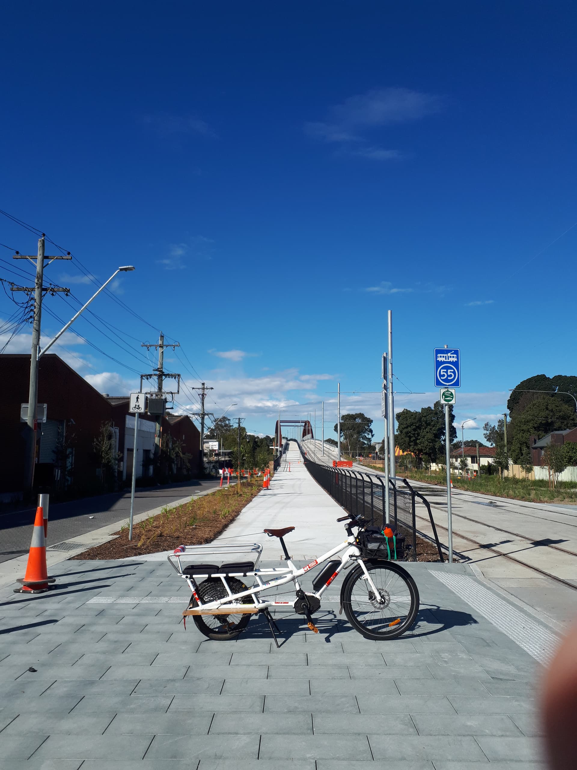 Dropped the boy child at a party today and had a couple of hours to kill. Cruised around on some river paths, checked out a new path network and light rail that’s opening soon and sat by the river with pastry and coffee for a while. The Yuba always gets lots of comments from passers by.