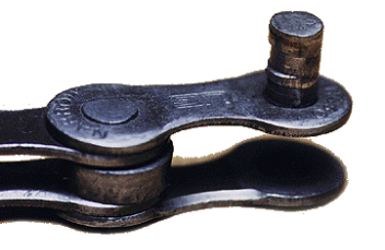 Cyclists often speak of chain āstretchā, as if the side plates of an old chain were pulled out of shape by the repeated stresses of pedaling. This is not actually how chains elongate. The major cause of chain āstretchā is wearing away of the metal where the link pin rotates inside of the bushing (or the ābushingā part of the inside plate) as the chain goes onto and off of the sprockets. If you take apart an old, worn-out chain, you can easily see the little notches worn into the sides of the link pins by the inside edges of the bushings, or the formed side plates of a bushingless chain.