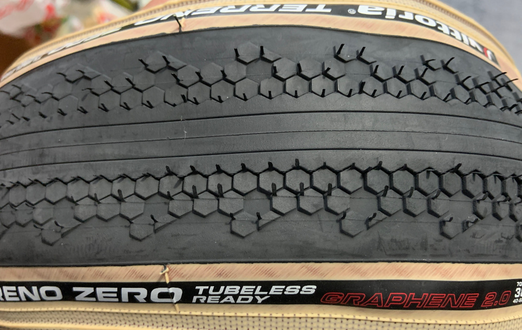 Vittoria Terreno Zero 700x38 tires. Tan sidewalls with dark-grey tread. Tubeless-ready, folding beads. New without packaging. $45/pair