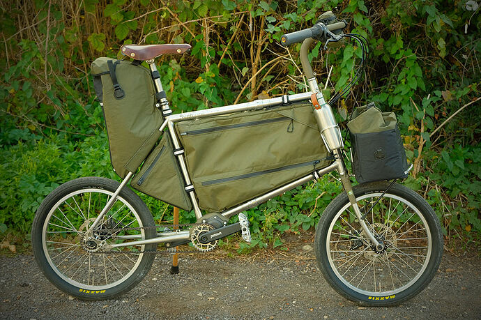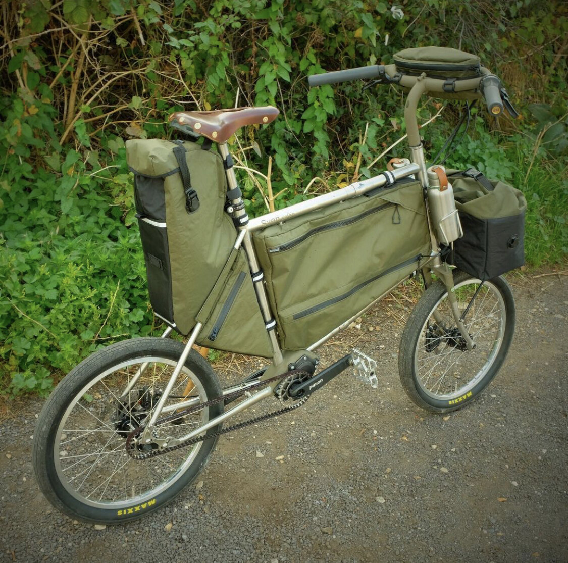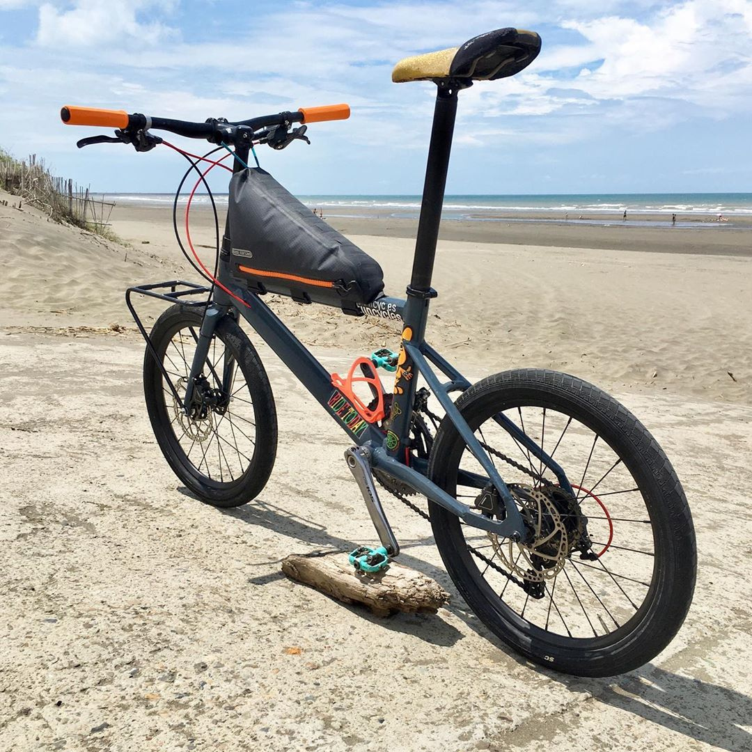 with 406 wheels, their custom rack, and an upside-down Ortlieb frame bag