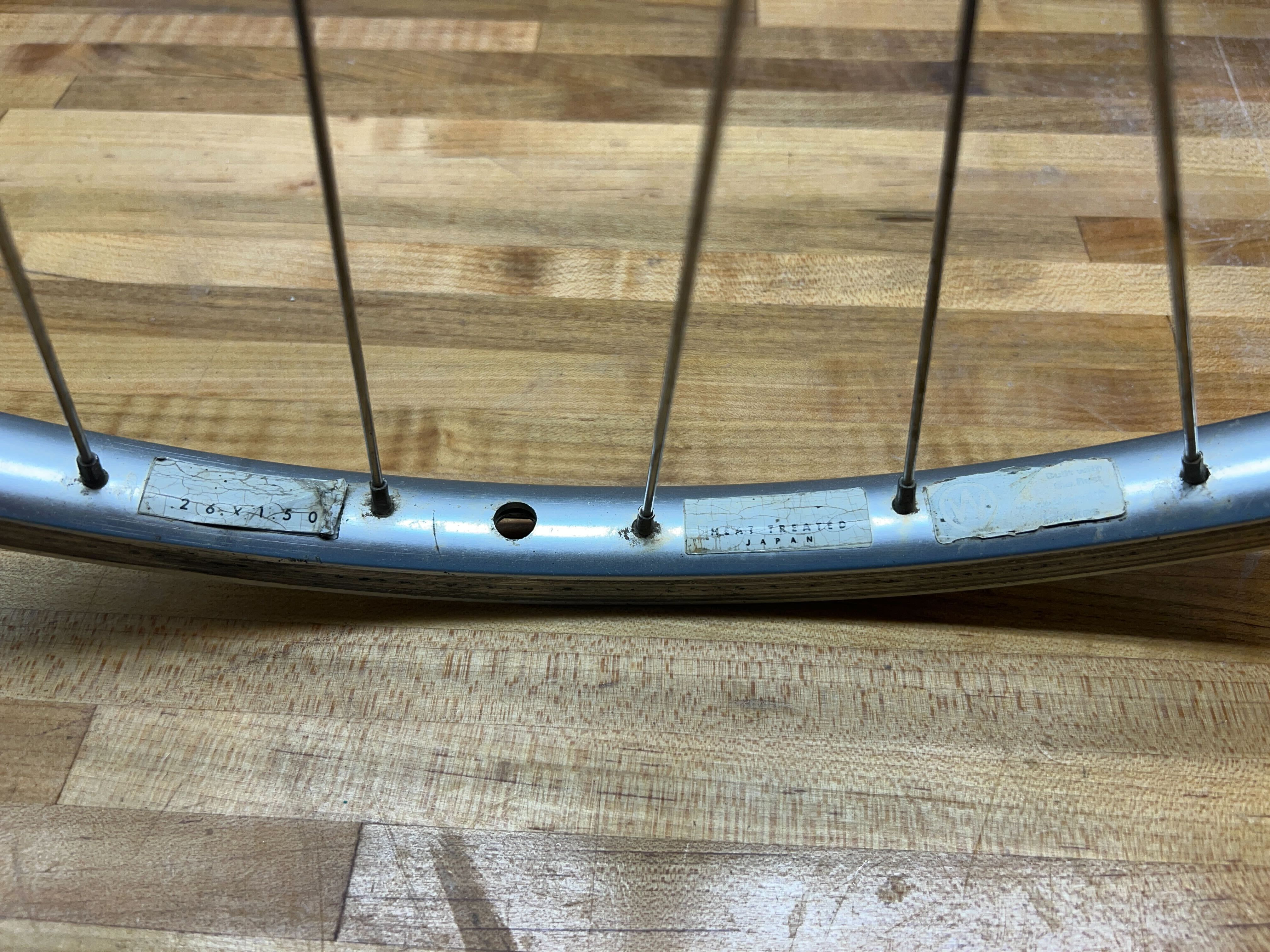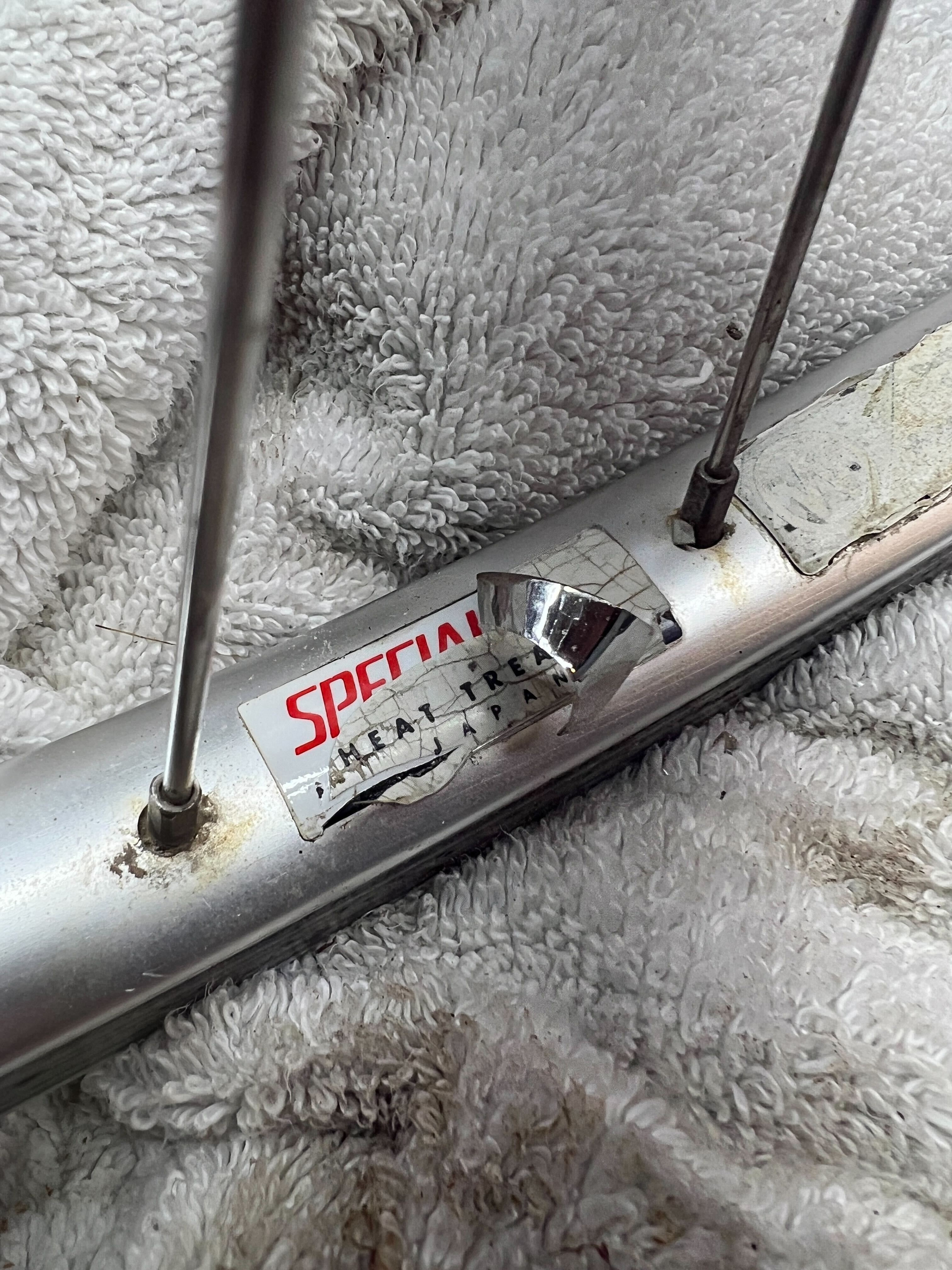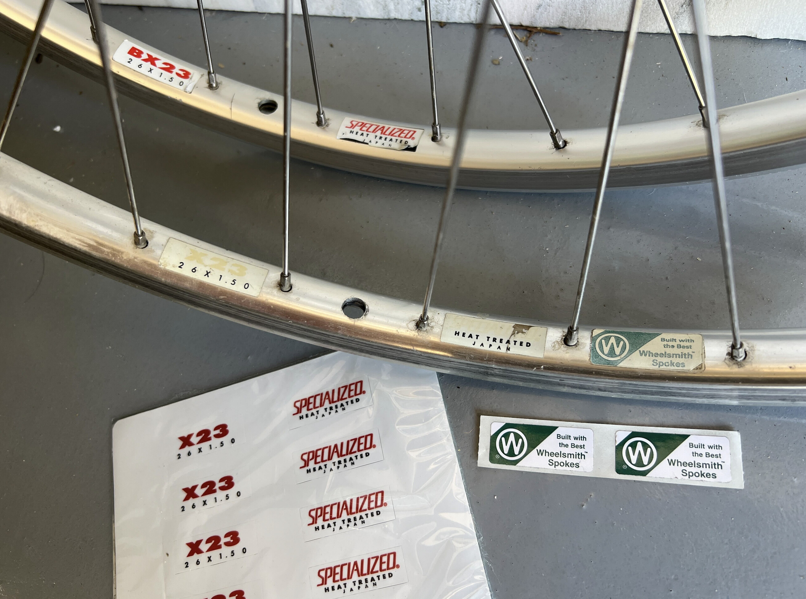 Now, you can’t see what the labels say, but if you’re familiar with the stock rims on 90s RockHoppers and StumpJumpers, you’ll know the one on the left is supposed to say “X23,” “BX23,” “GX23,” etc. in a large red font, and then the other one has the OG Specialized logo in red. The third sticker is a Wheelsmith spokes decal.
