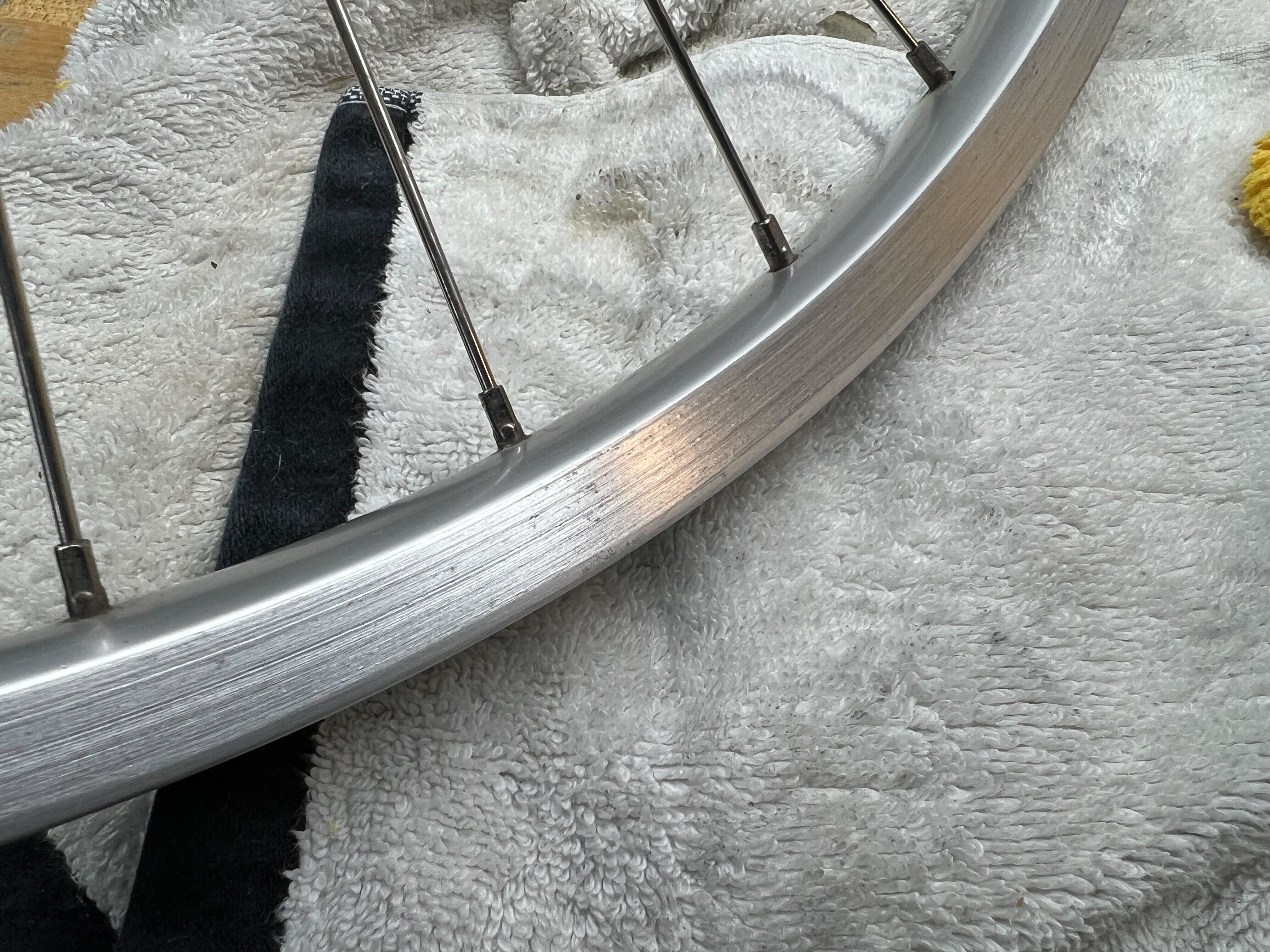 Got things looking fairly decent with Nevr-Dull on the rim bed/spoke bed (whatever you call the area with the holes in it…), and then rubbed the braking surface with a scuffing pad.