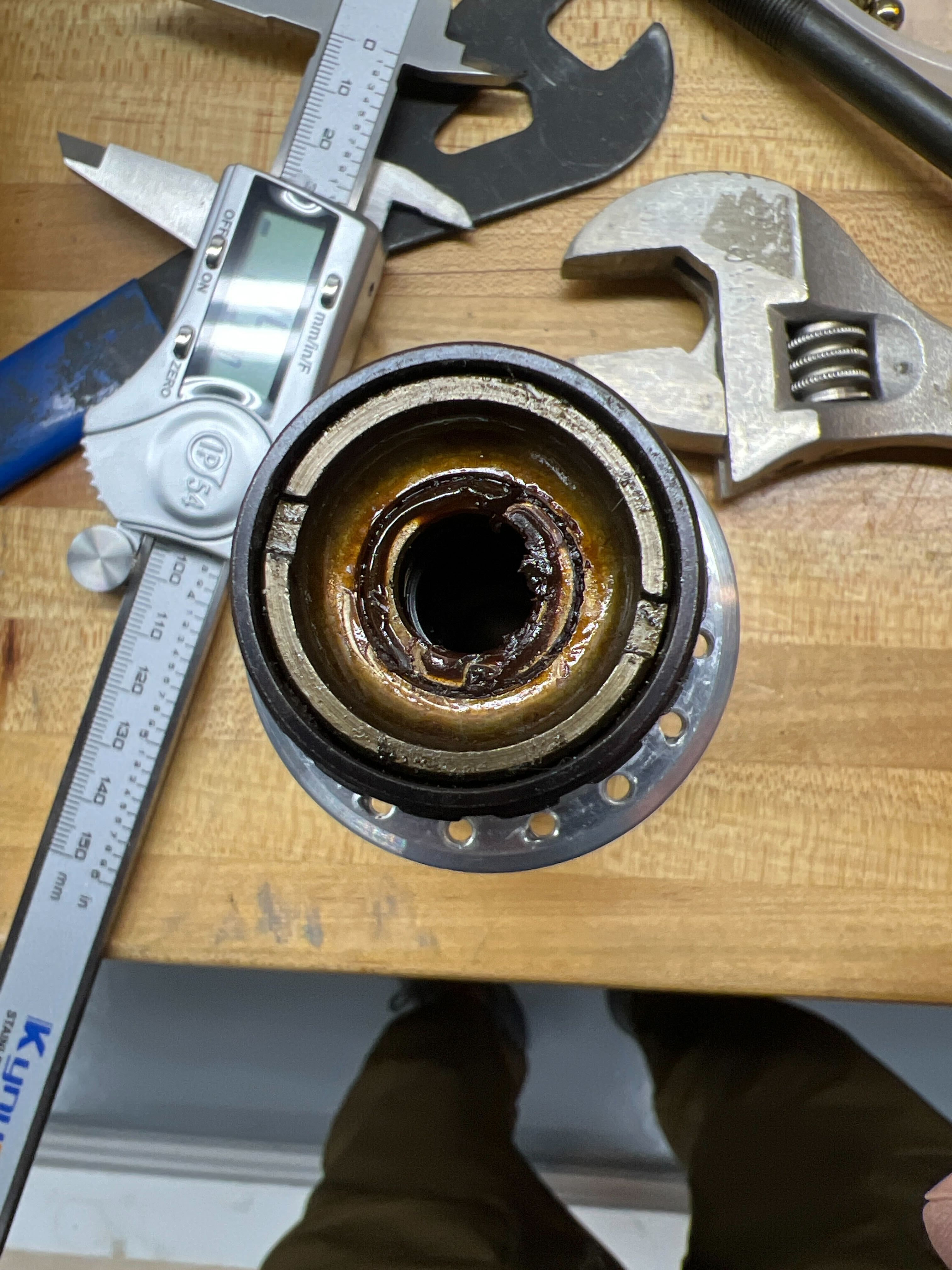Tried with a hammer and screwdriver already, as well as a pin spanner. I tried both ways, and it’s likely reverse-threaded. I sprayed it with PB Blaster while I’m waiting for the removal tool.