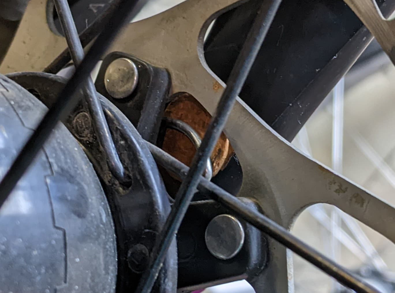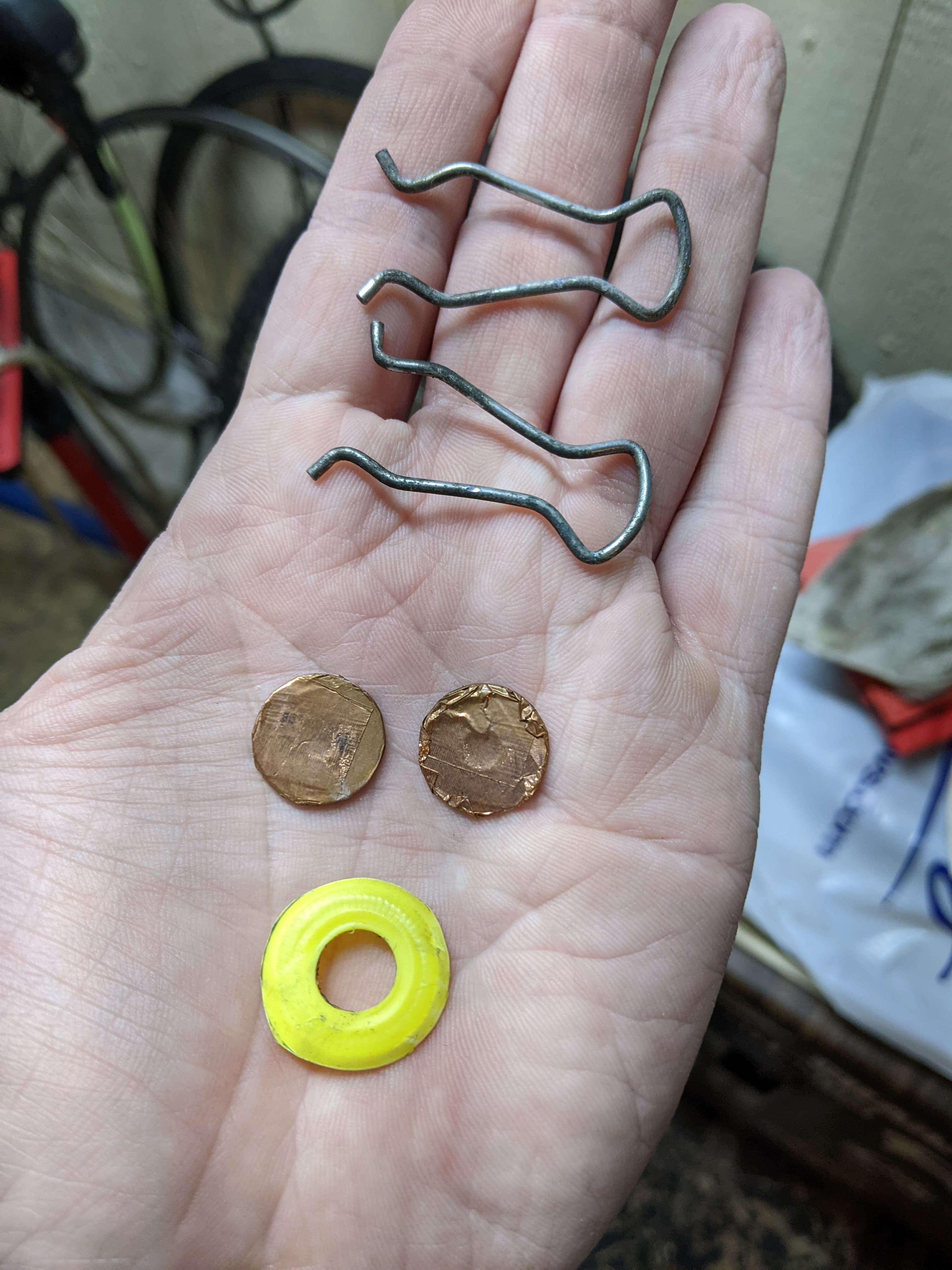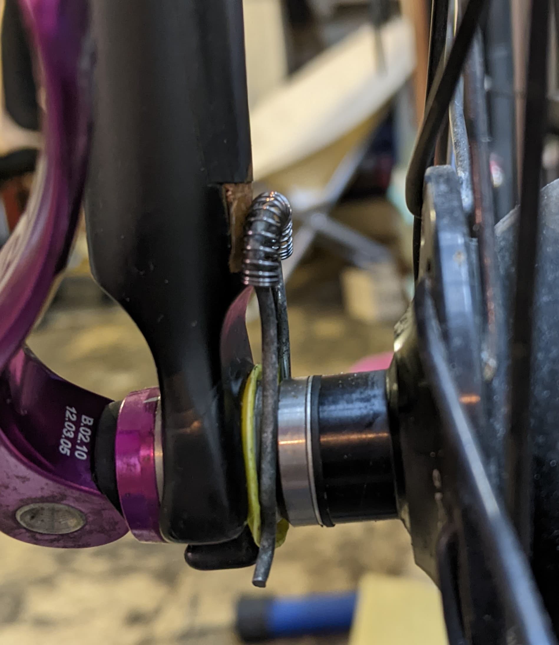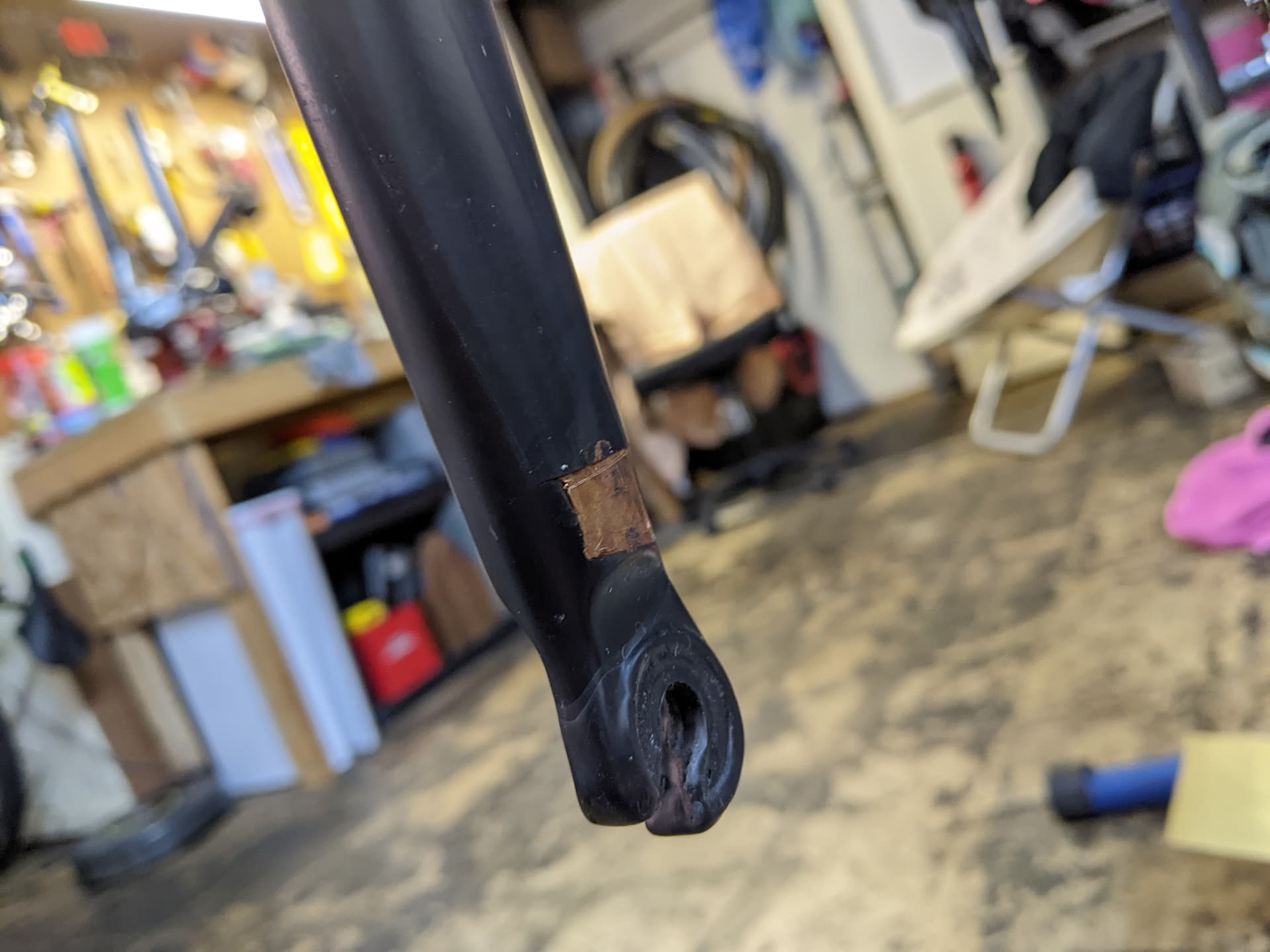 Most of the copper foil tape is now buried under electrical tape, but there’s a bit peaking out at the bottoms of the fork legs. You’ll get the idea.