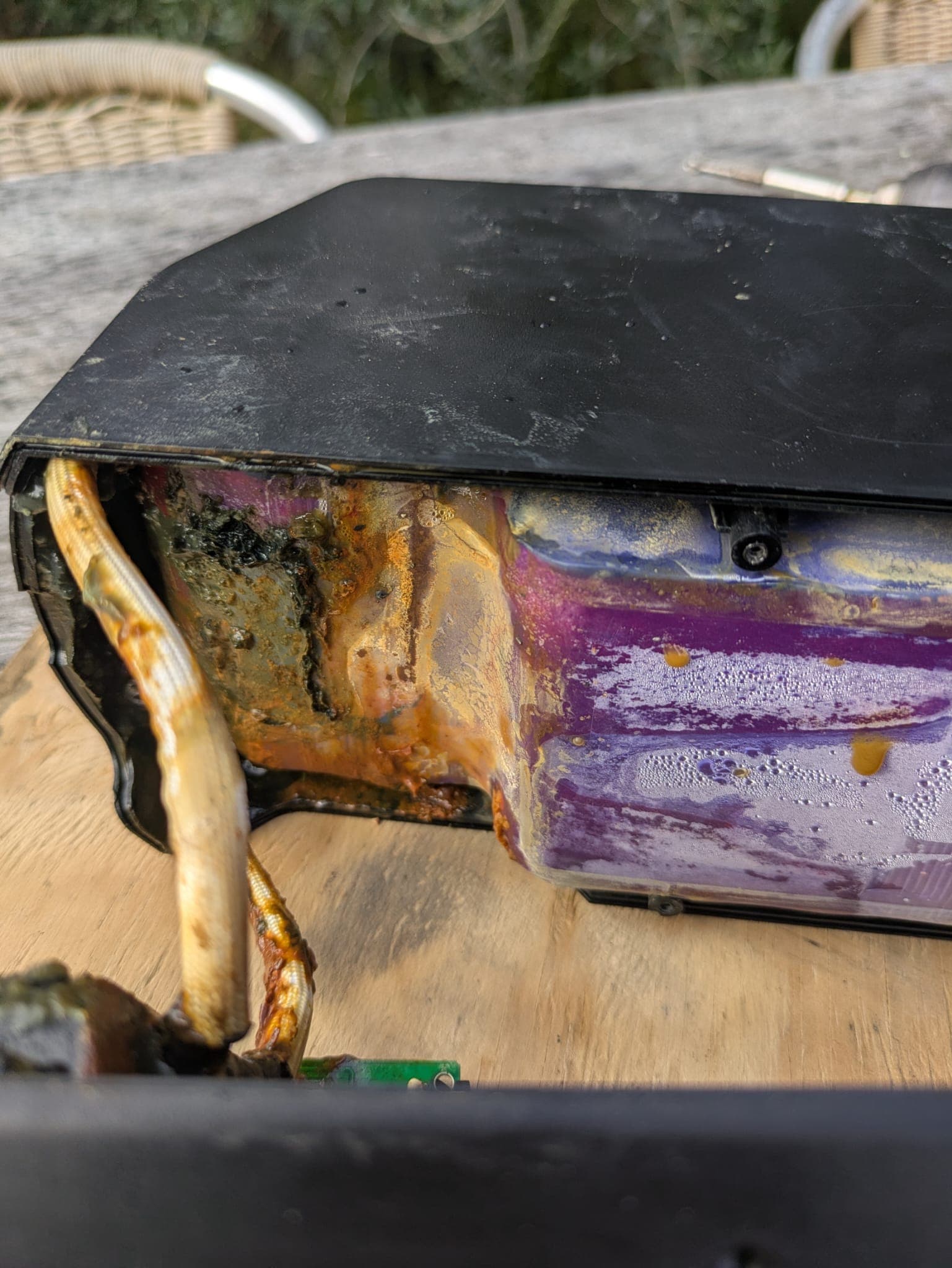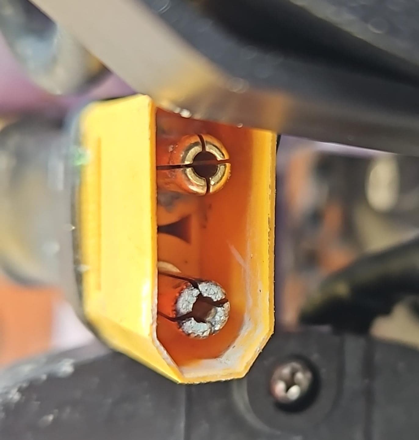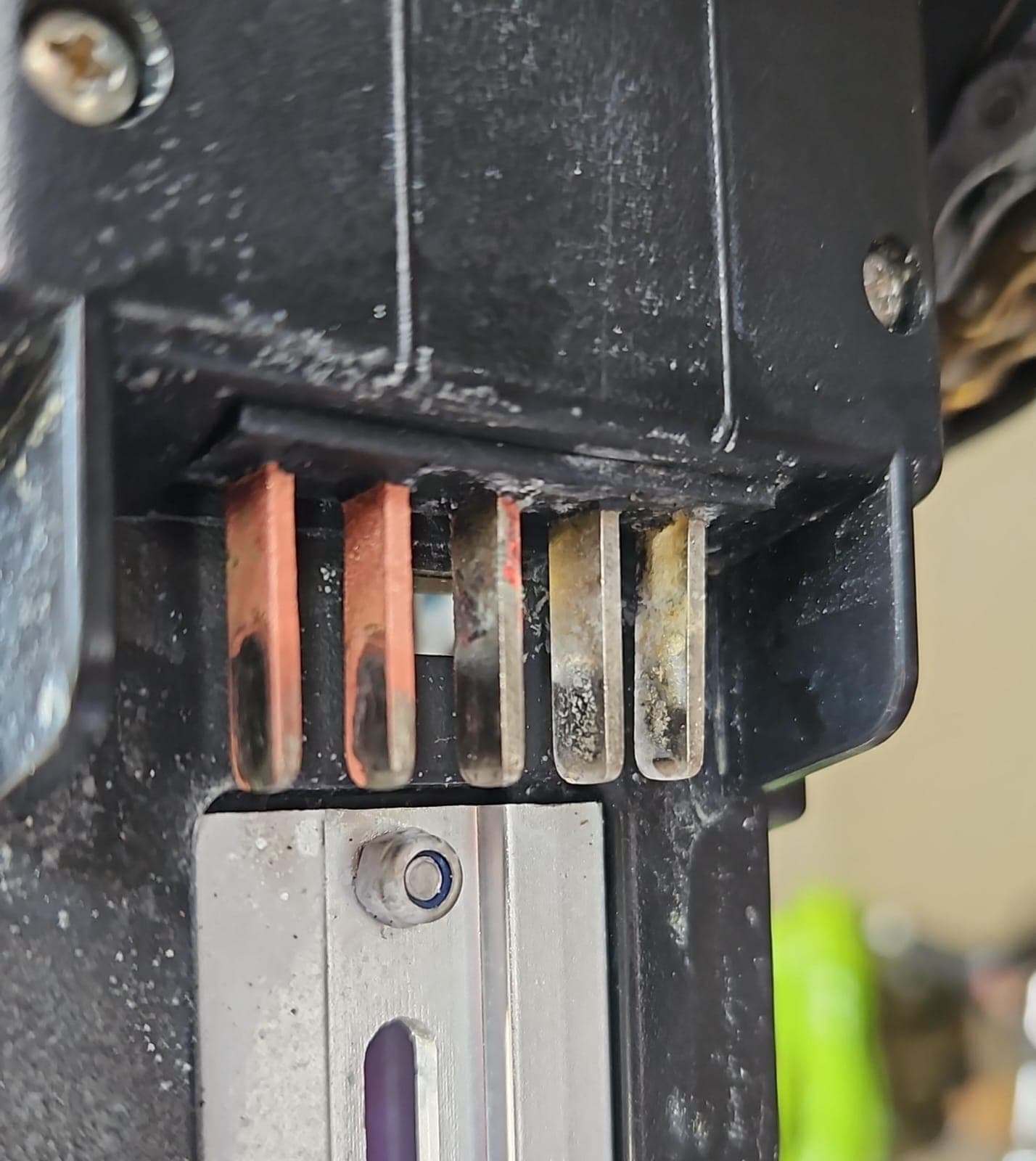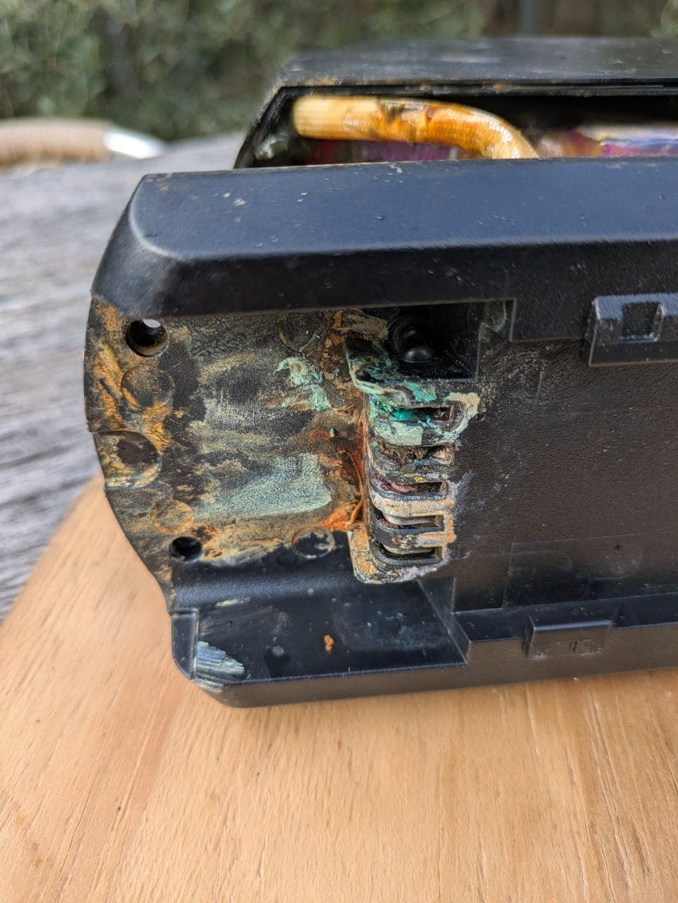 The battery mount appears (assuming they were all silver before) to have lost the plating on two of the 5 pins, they’re bare copper and the others are silver coloured. corrosion/electrolysis perhaps.
