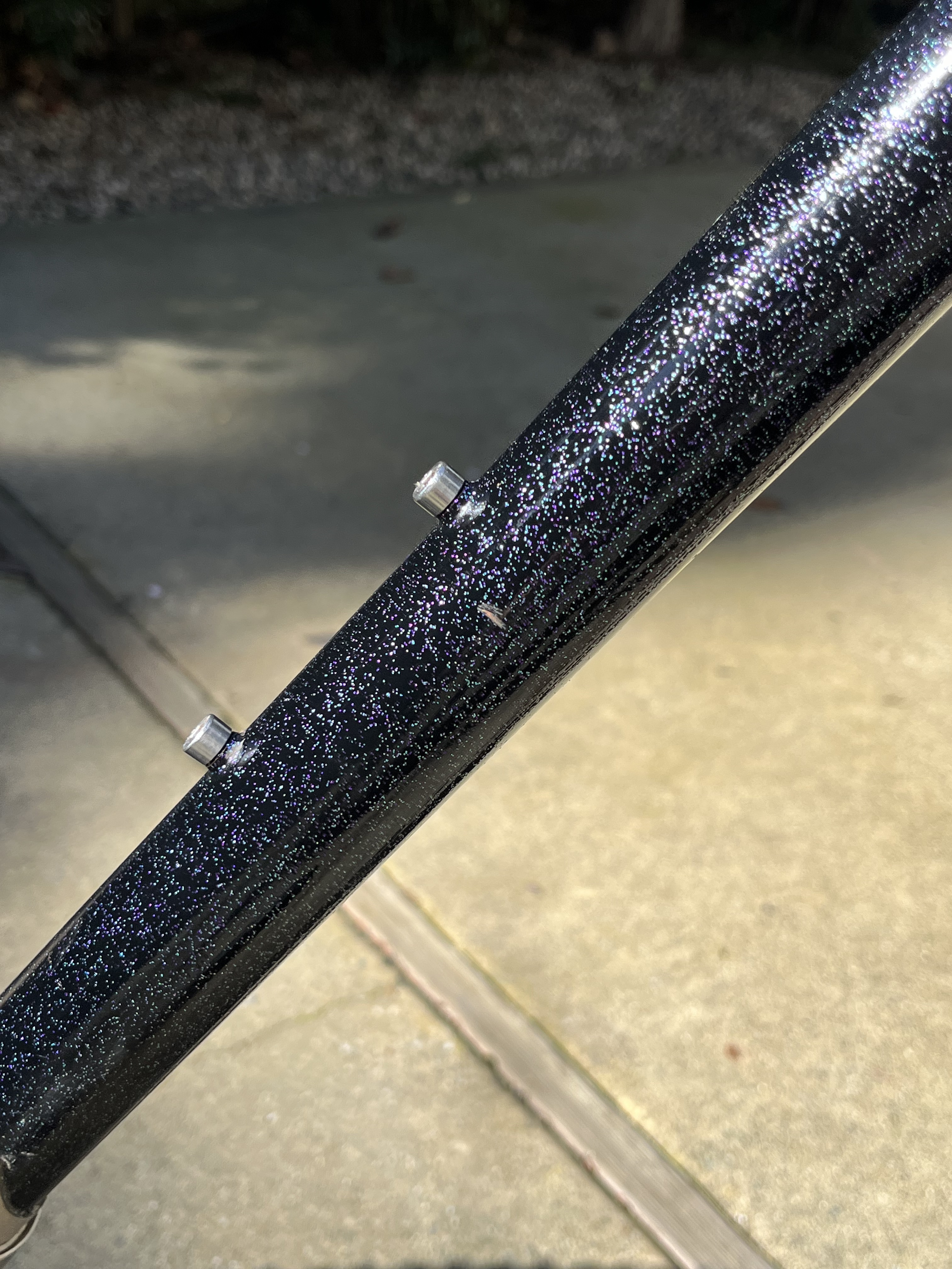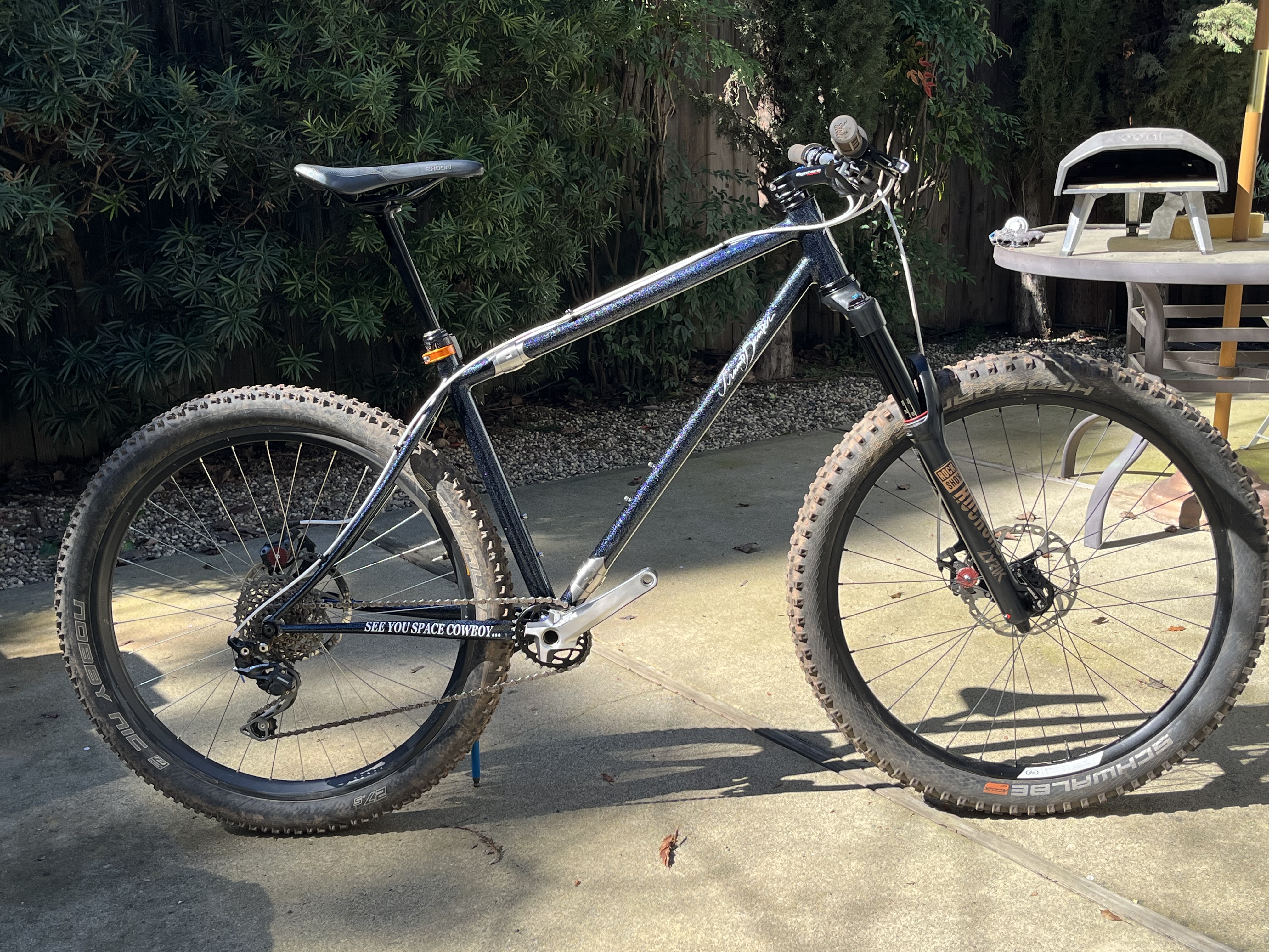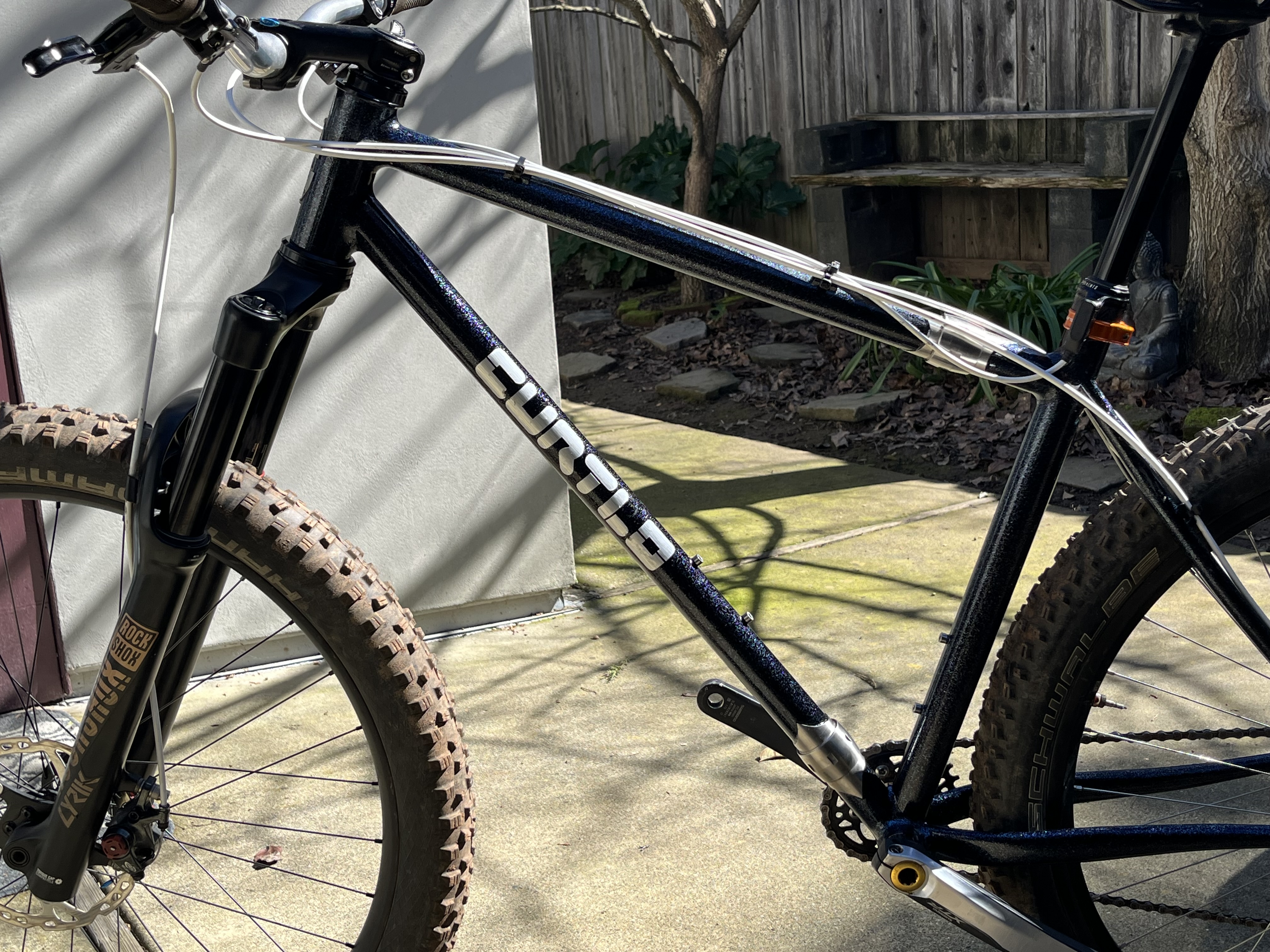 Here’s the curtlo mentioned in the Craigslist thread. Was originally designed around a 120mm fork - currently using a 140mm lyrik with a 2* wolftooth angle set. Note, now the fork barely has enough steerer so the syntace stem is partly to account for that (about 25mm exposed steerer above the headset). Finish is prismatic powders “disco nights” - pub-7055. Has been pretty durable (pictured a chip on the down tube and seat stay), though it’s not a smooth finish. When you touch it you can feel the glitter and it’s pretty bumpy