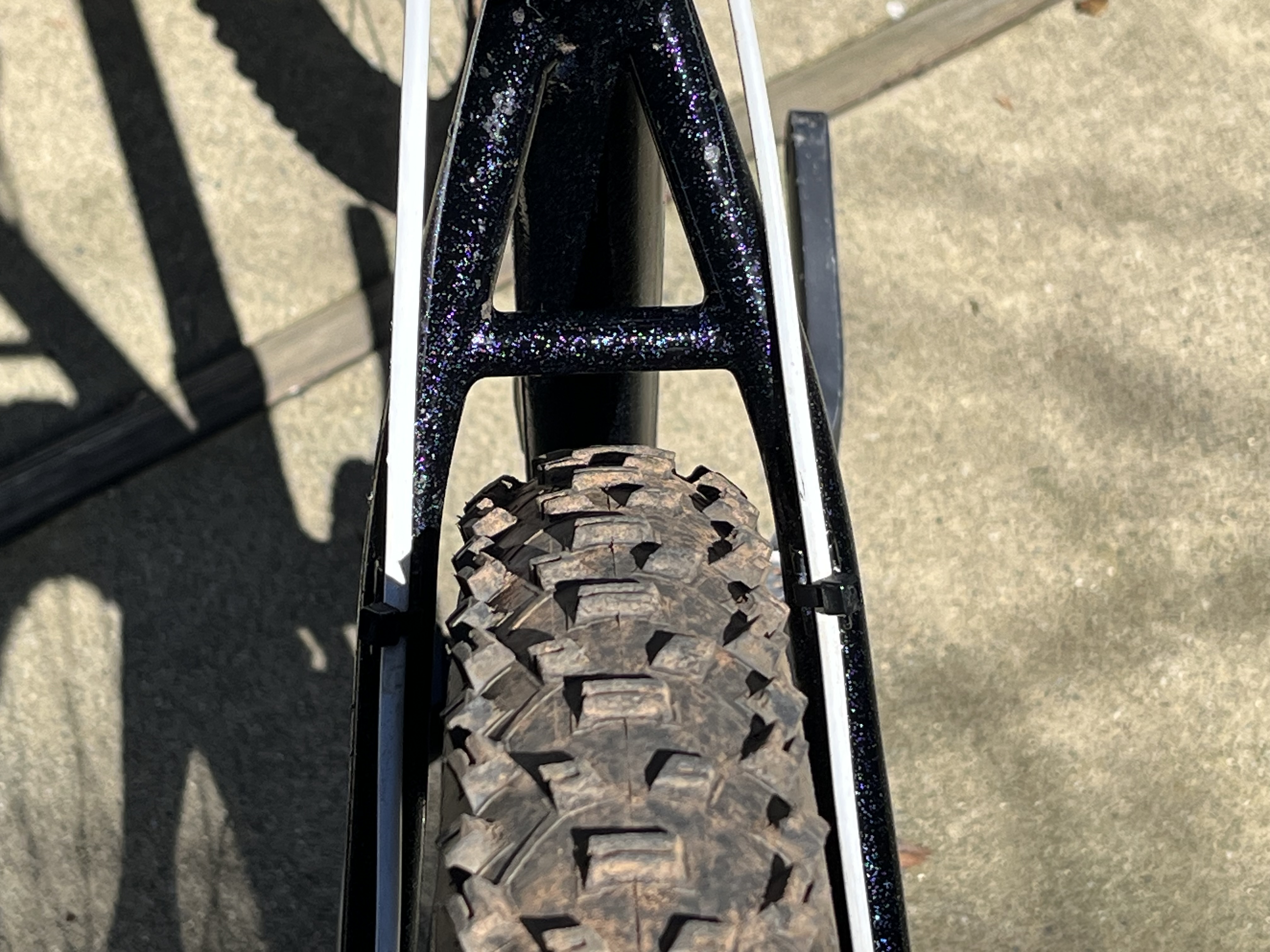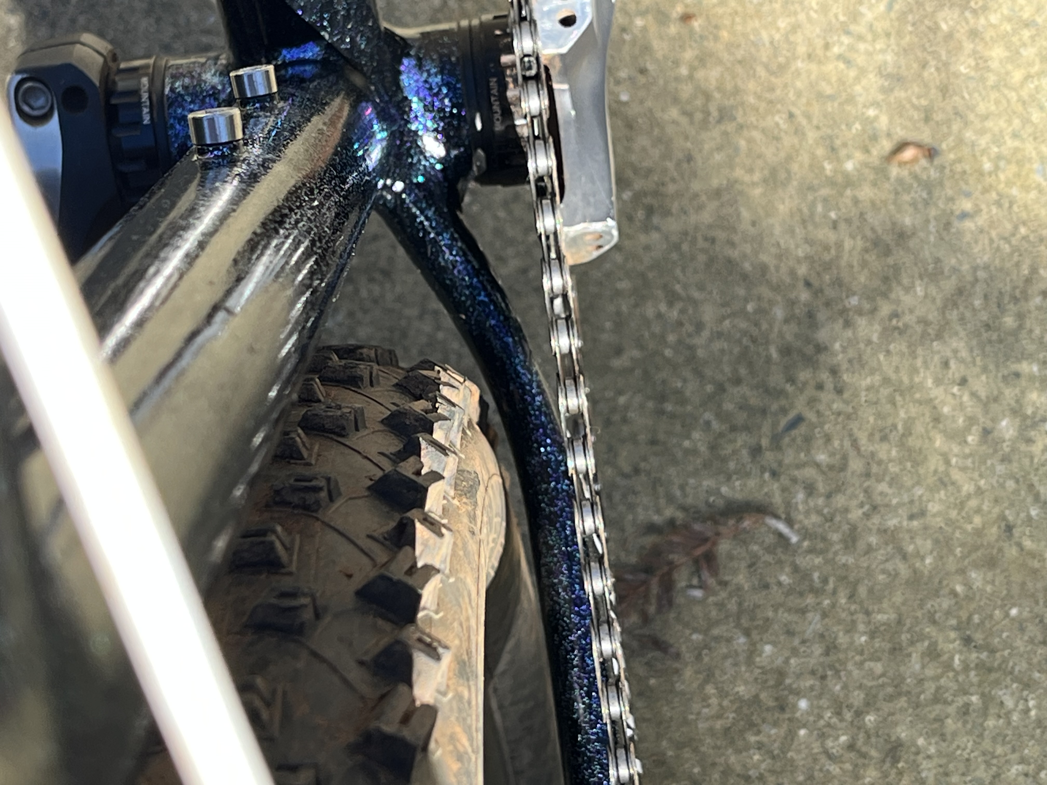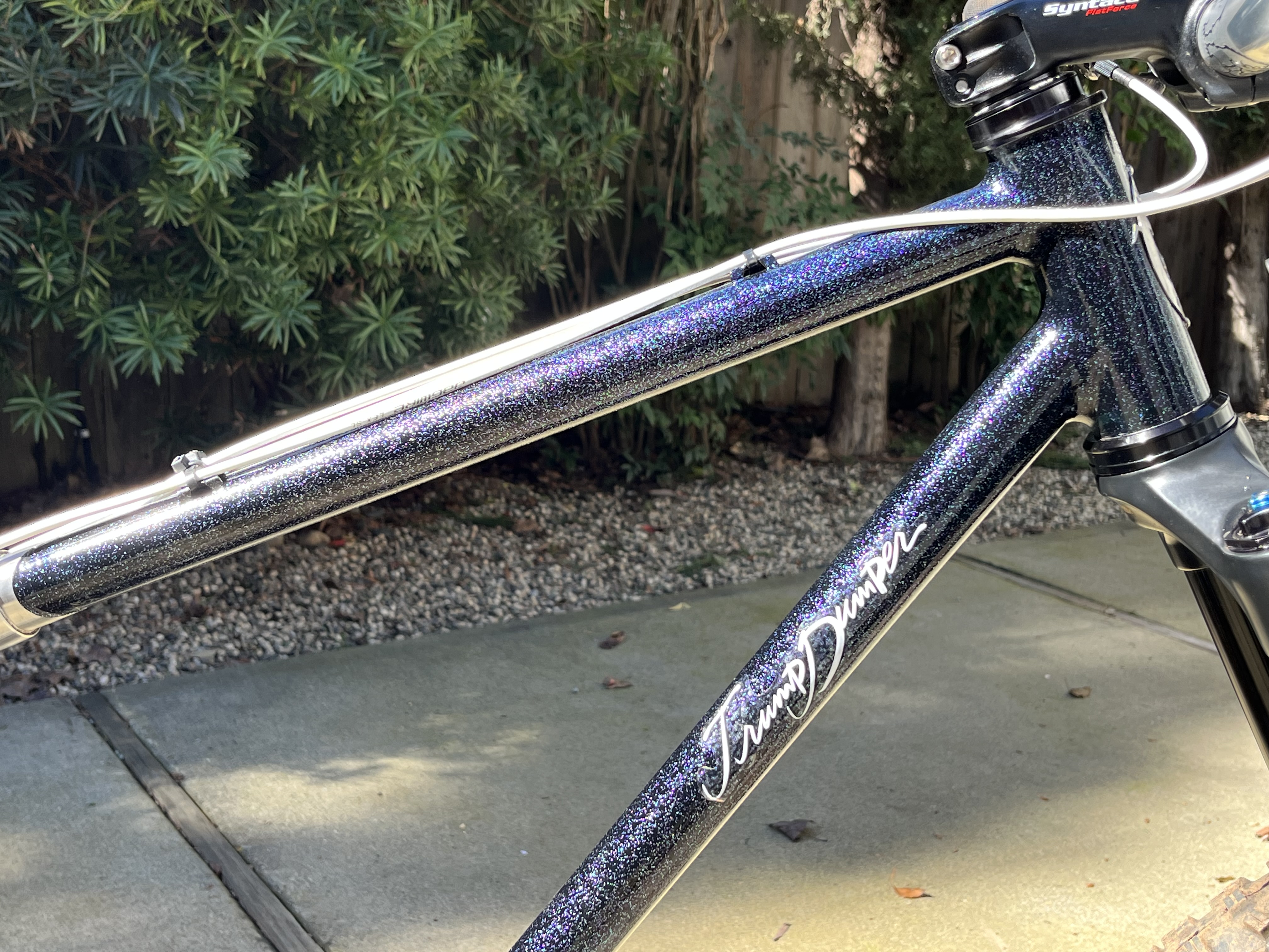 Here’s the curtlo mentioned in the Craigslist thread. Was originally designed around a 120mm fork - currently using a 140mm lyrik with a 2* wolftooth angle set. Note, now the fork barely has enough steerer so the syntace stem is partly to account for that (about 25mm exposed steerer above the headset). Finish is prismatic powders “disco nights” - pub-7055. Has been pretty durable (pictured a chip on the down tube and seat stay), though it’s not a smooth finish. When you touch it you can feel the glitter and it’s pretty bumpy