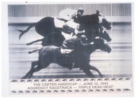 The photo finish is pretty rad, but they’ve been doing it for a while. The old school way used a camera with a slit aperture and a moving film strip. It’s not really a photo, rather, it’s a graph of what the plane of the finish line looked like over time. That’s why you get the weird effects like the curved spokes, and why the ground looks the exact same along the length of the photo.