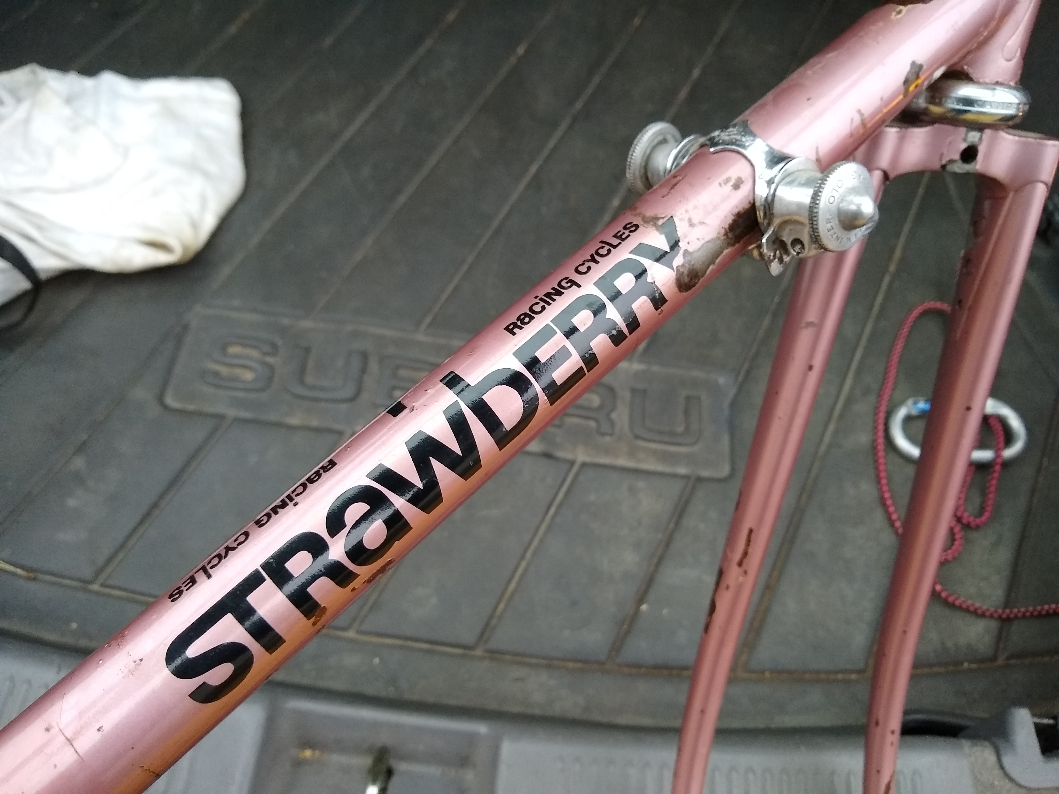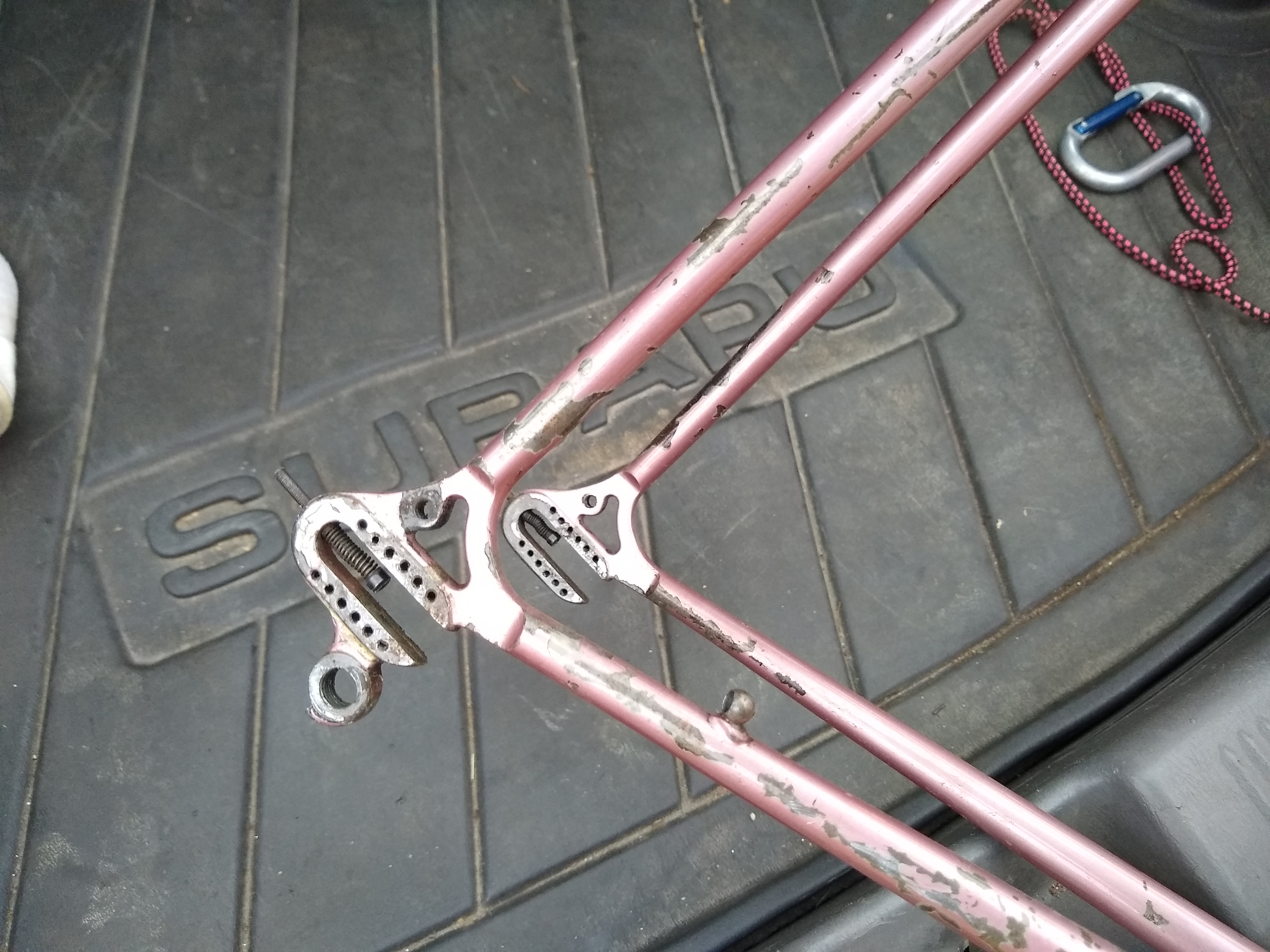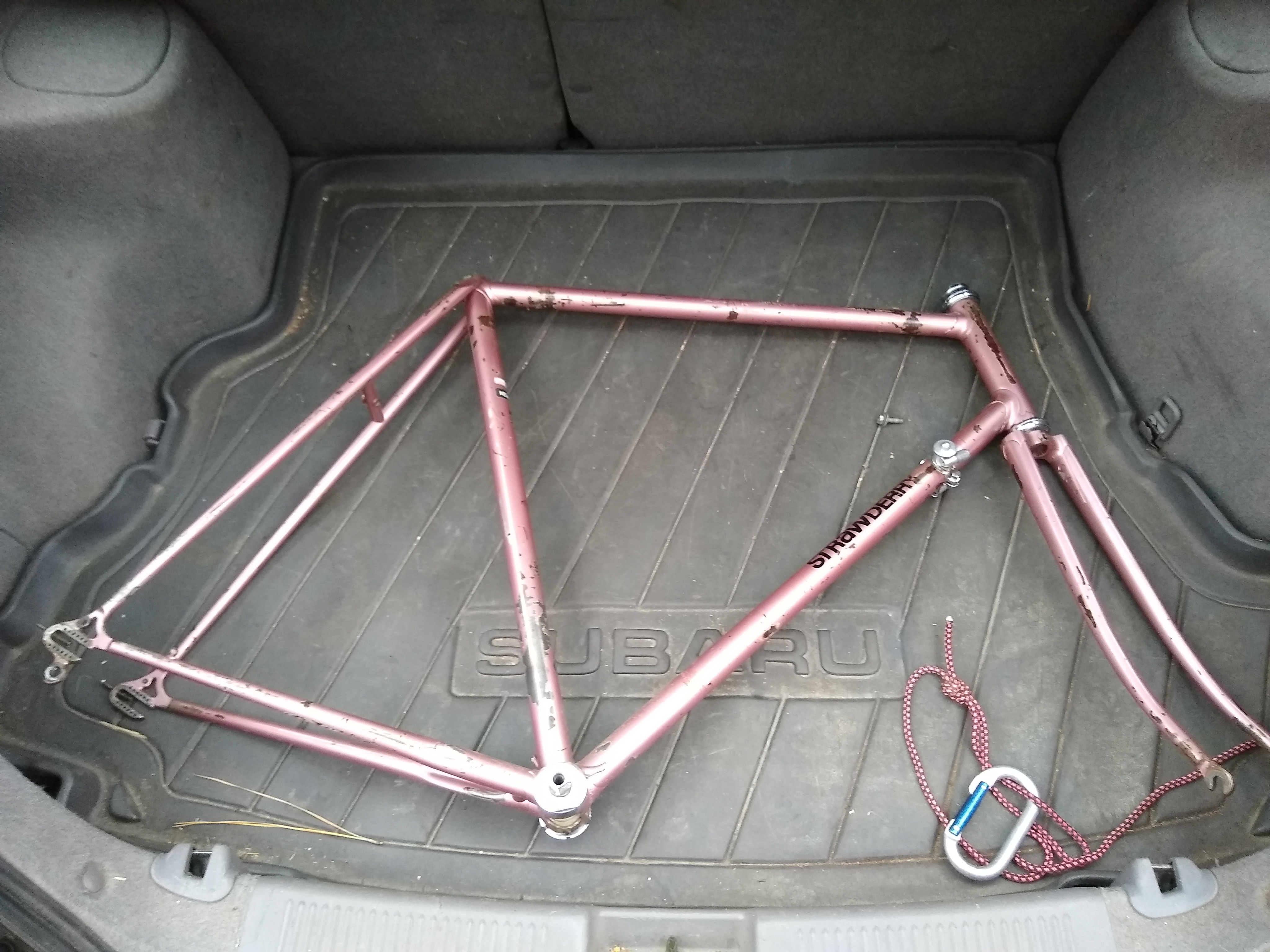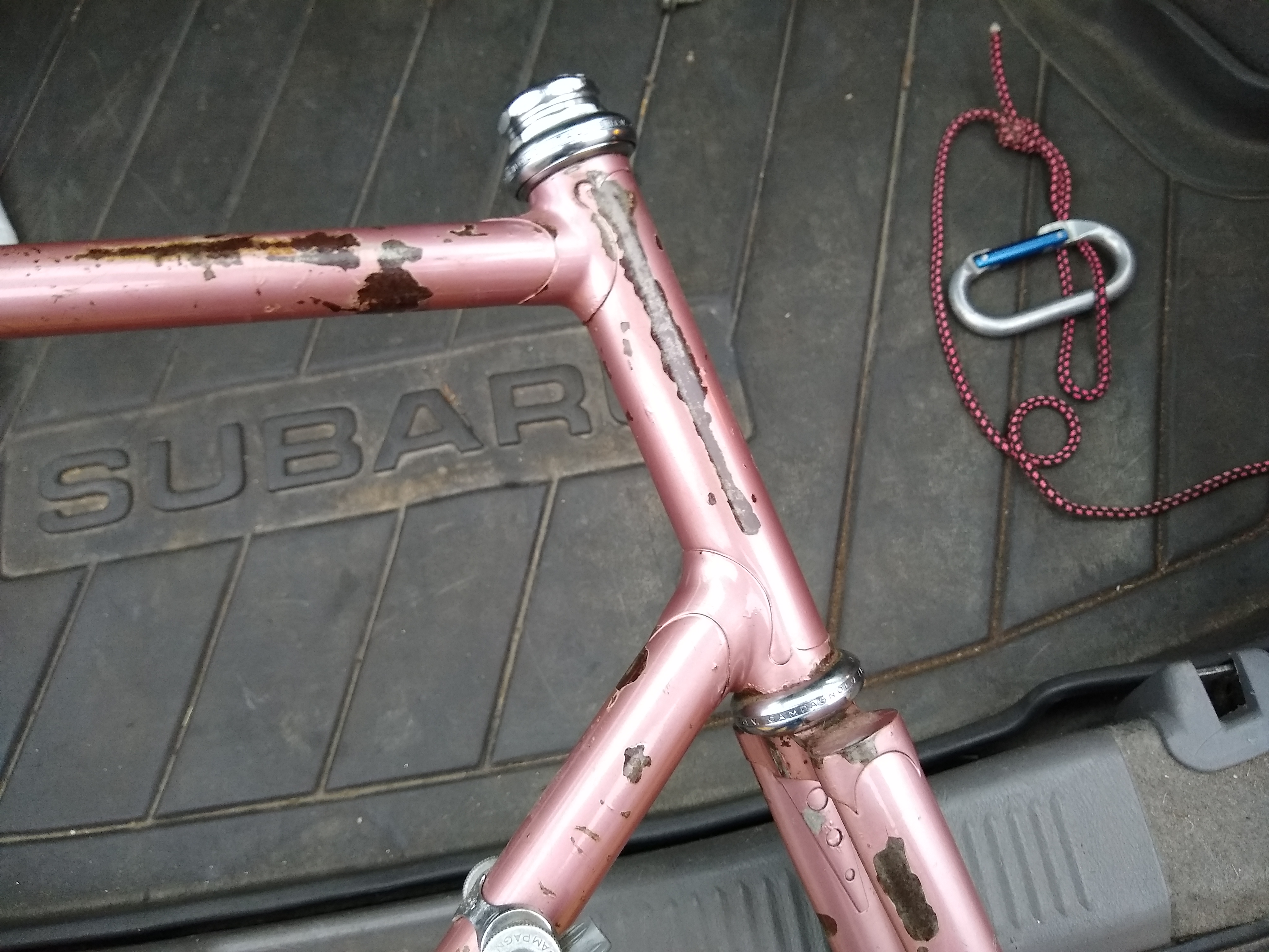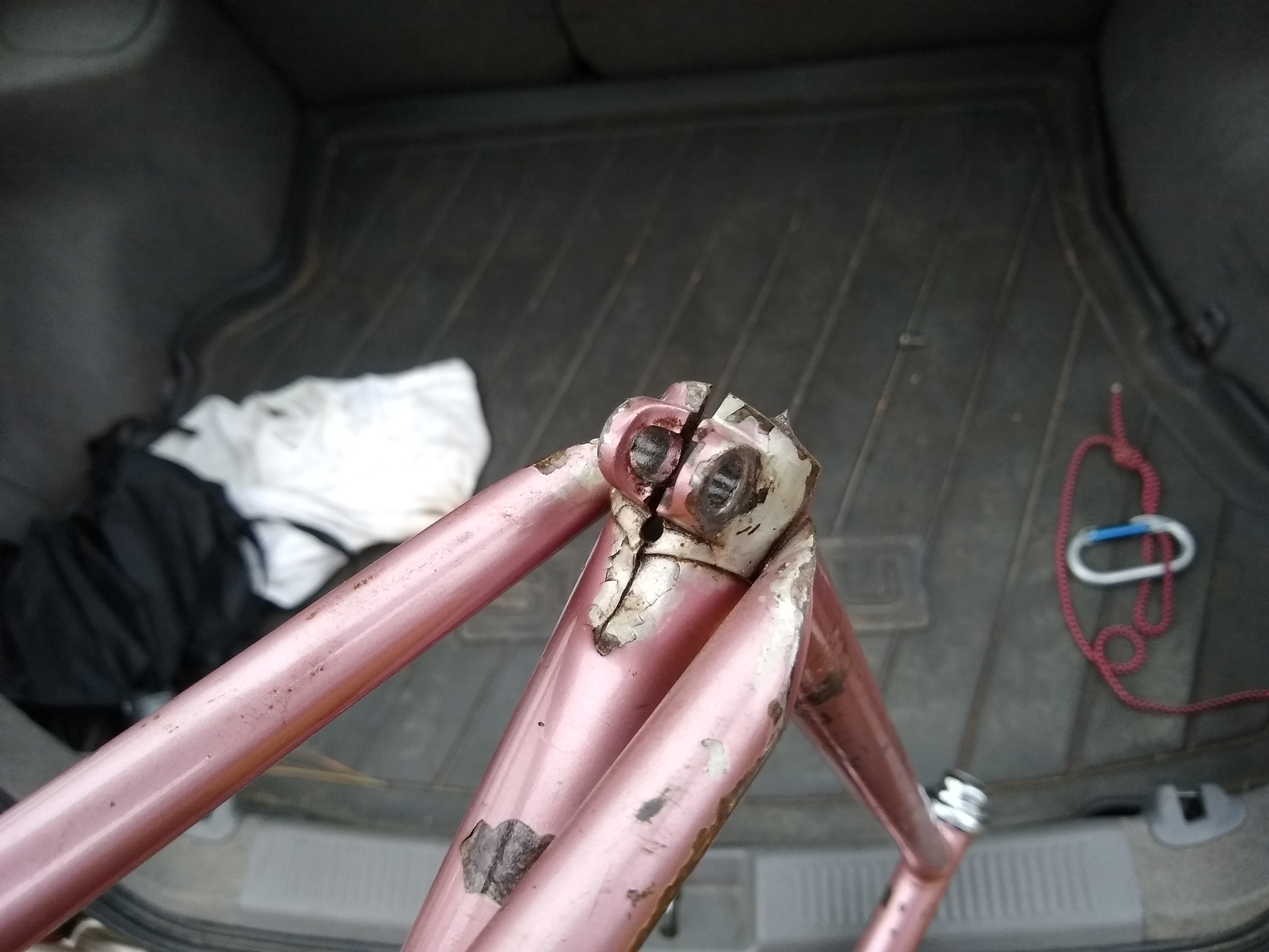 Multiple small dings, surface rust, missing paint, crack at the seat post binder slot, dented/scarred on the seat tube where someone either way-overclamped a FD, or just clamped the whole frame in a stand too tight.