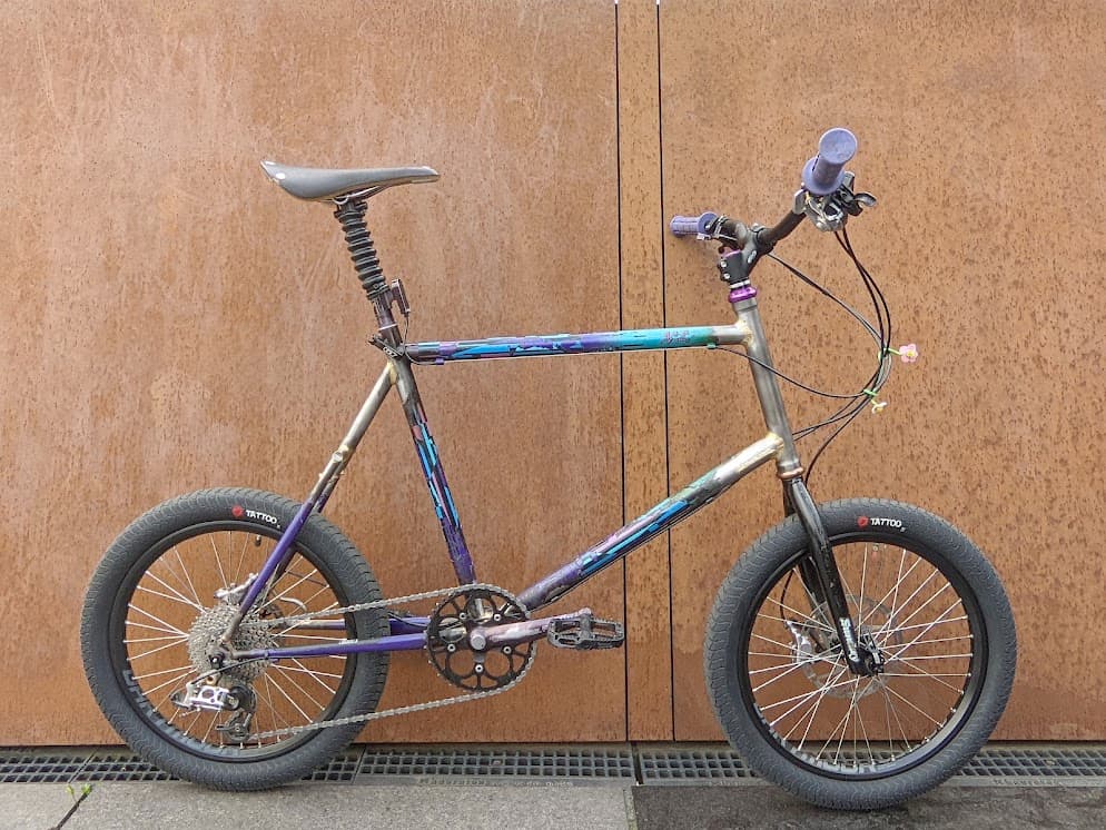 found on reddit. dude made a minivelo mostly out of a recycled existing frame. whole bunch of photos documenting the process here: https://photos.google.com/share/AF1QipPAmLcktE2_0bjEs1srf7_IInnXdAZJR4Smszpf_Mno6_sBRPv4uAfsGXU95q-tag?key=SDhwblBNeWhiSU11RHNVTHVvdlBkTDYtbV9zTENn