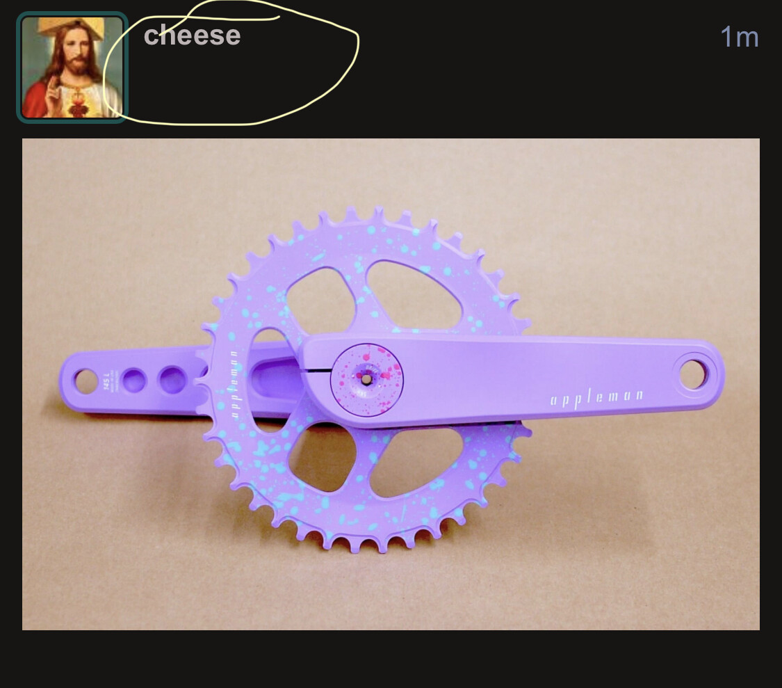 I hate the design and the name of appleman cranks and they’re the only ones doing anything interesting with colors on cranksets and are constantly hitting it out of the park on color combinations. I’m so conflicted.