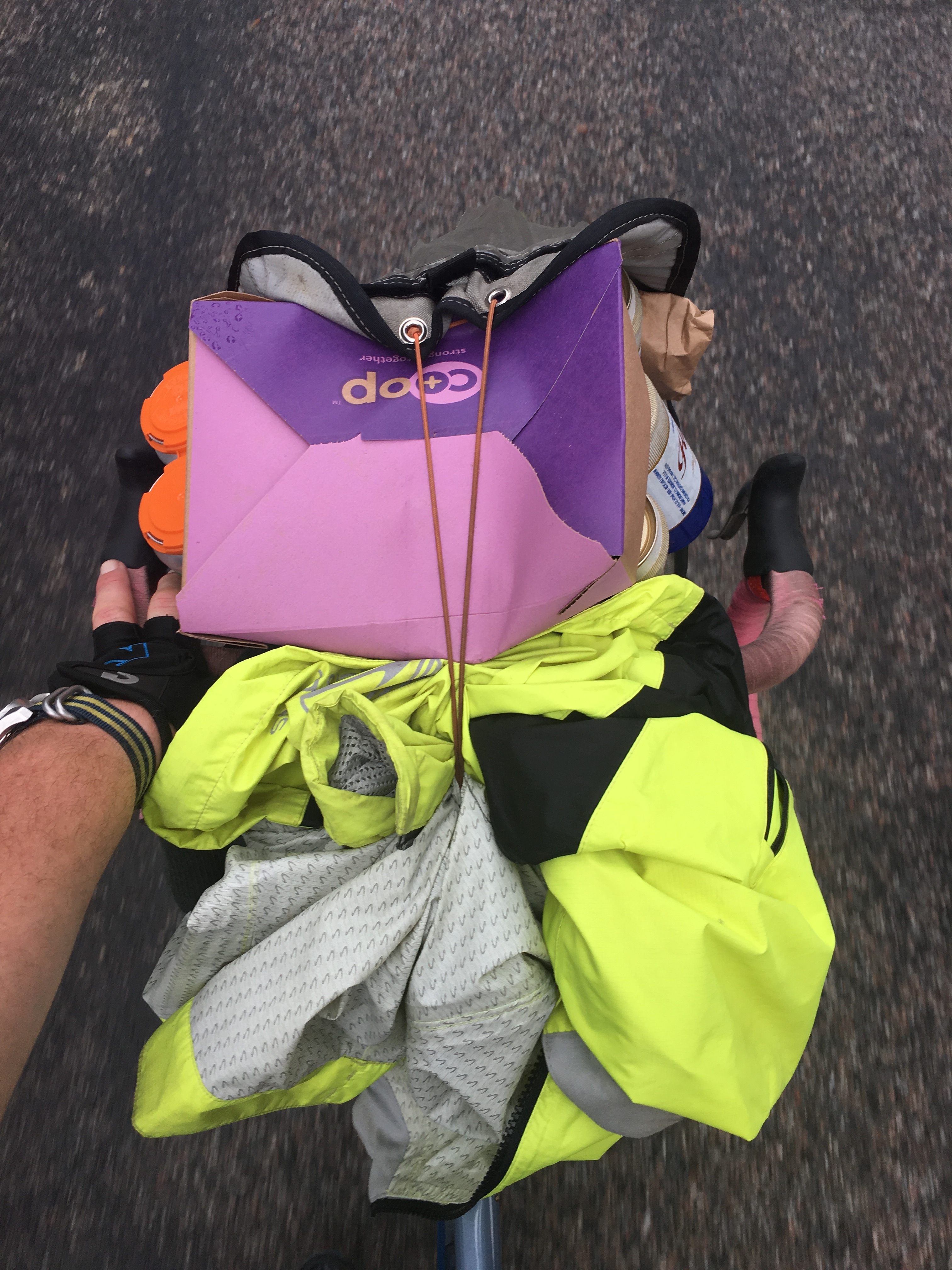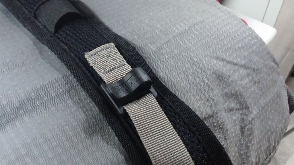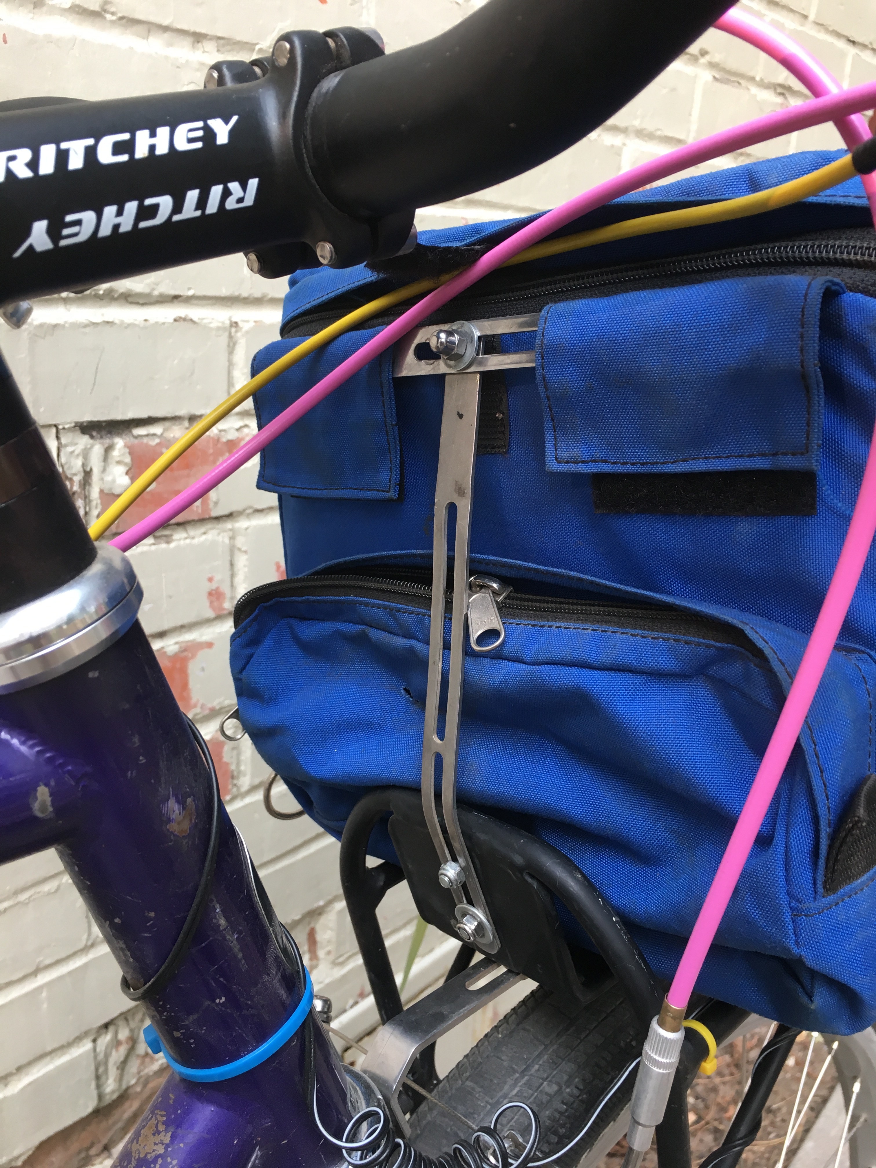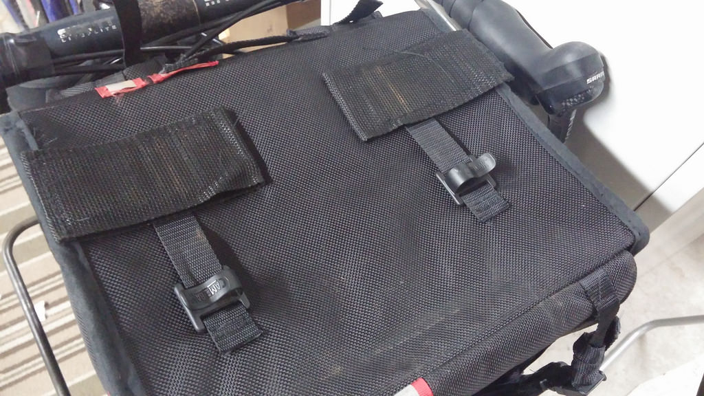 This is still one of the better solutions I’ve come up with, in terms of requiring no modification or special mountings on the rack. Does require the bag to have some non-standard webbing.