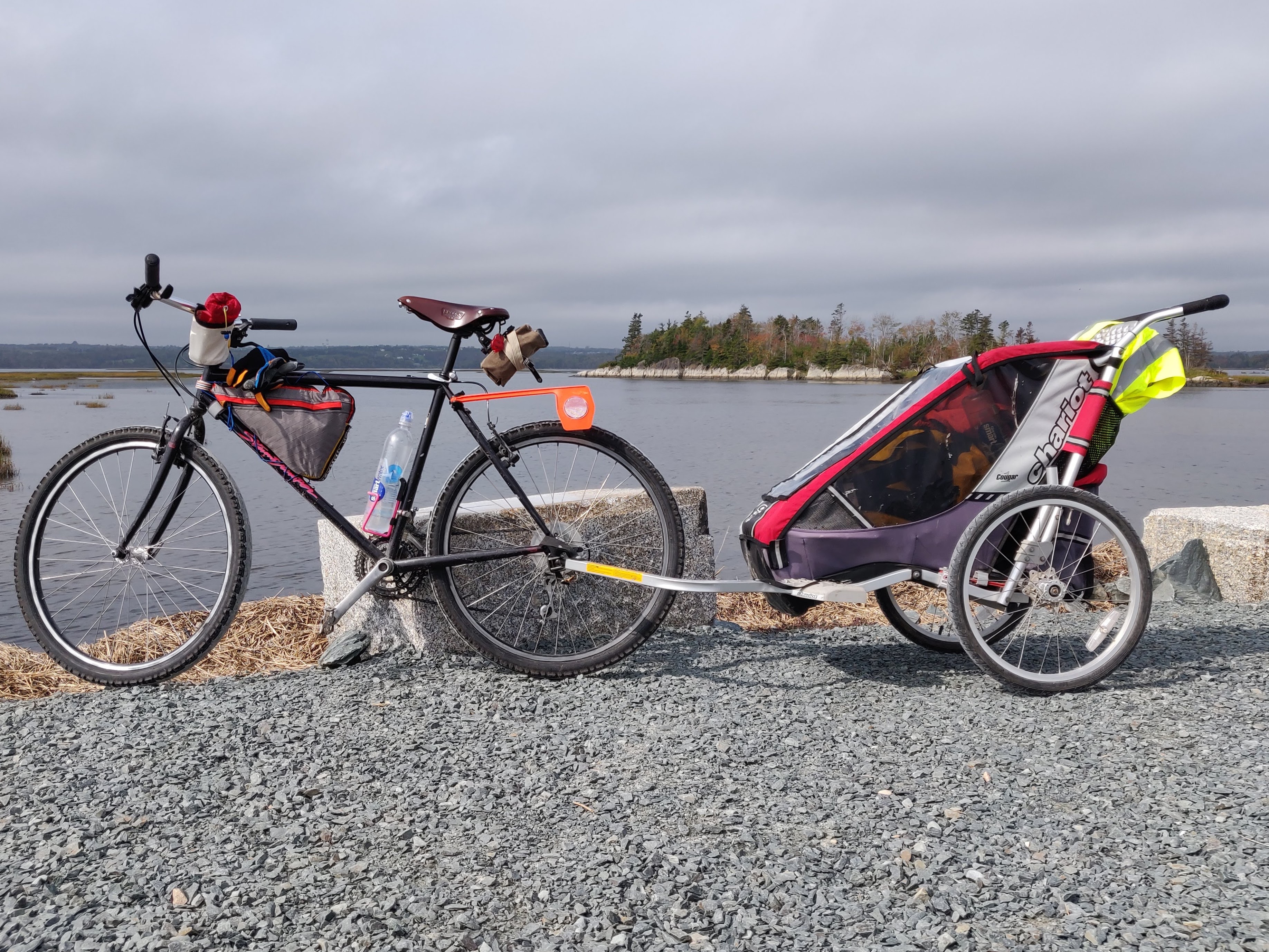 This was an overnight trip in Nova Scotia where I was testing the roadworthiness of a used Chariot trailer my brother bought for his kid to ride in. I left the bike there for him to make use of hauling child.