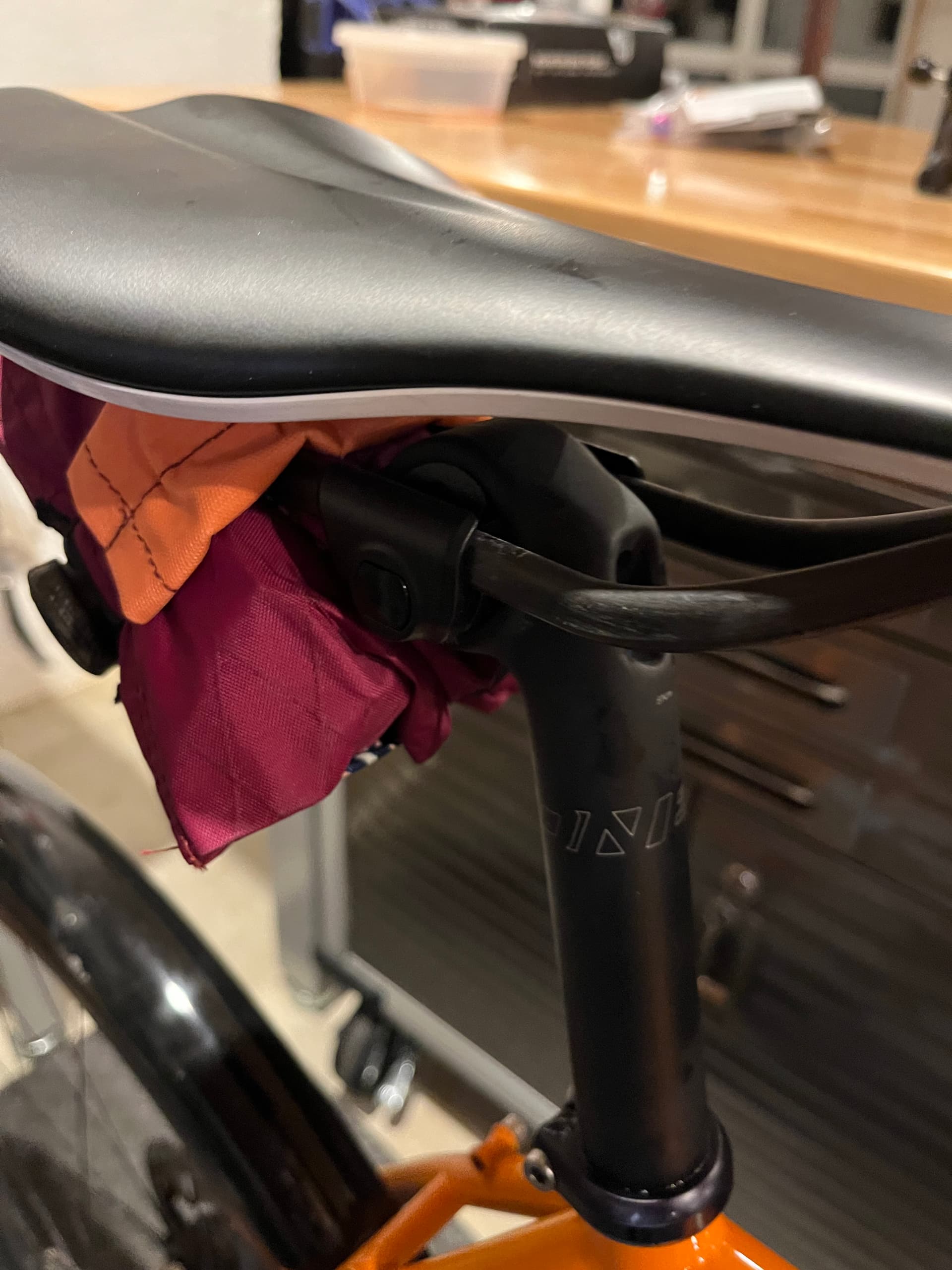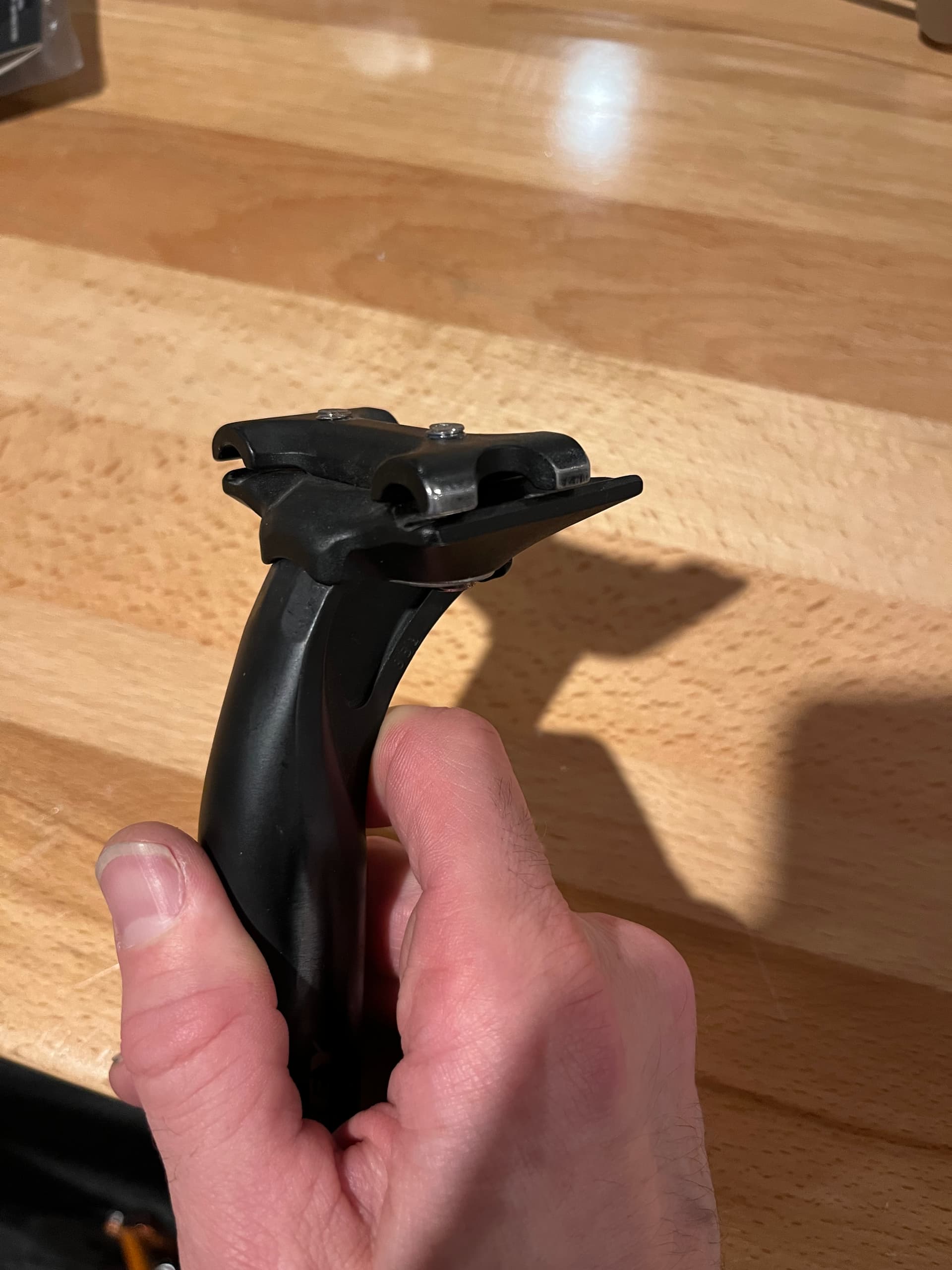 Replaced the seat post that has been wearing holes in my bib shorts. I figure since the replacement averts the premature death of at least two pairs of bibs, I could splurge and spend a katu on a nice carbon post. It’s got 5mm more setback and the clamp is nicely chamfered.