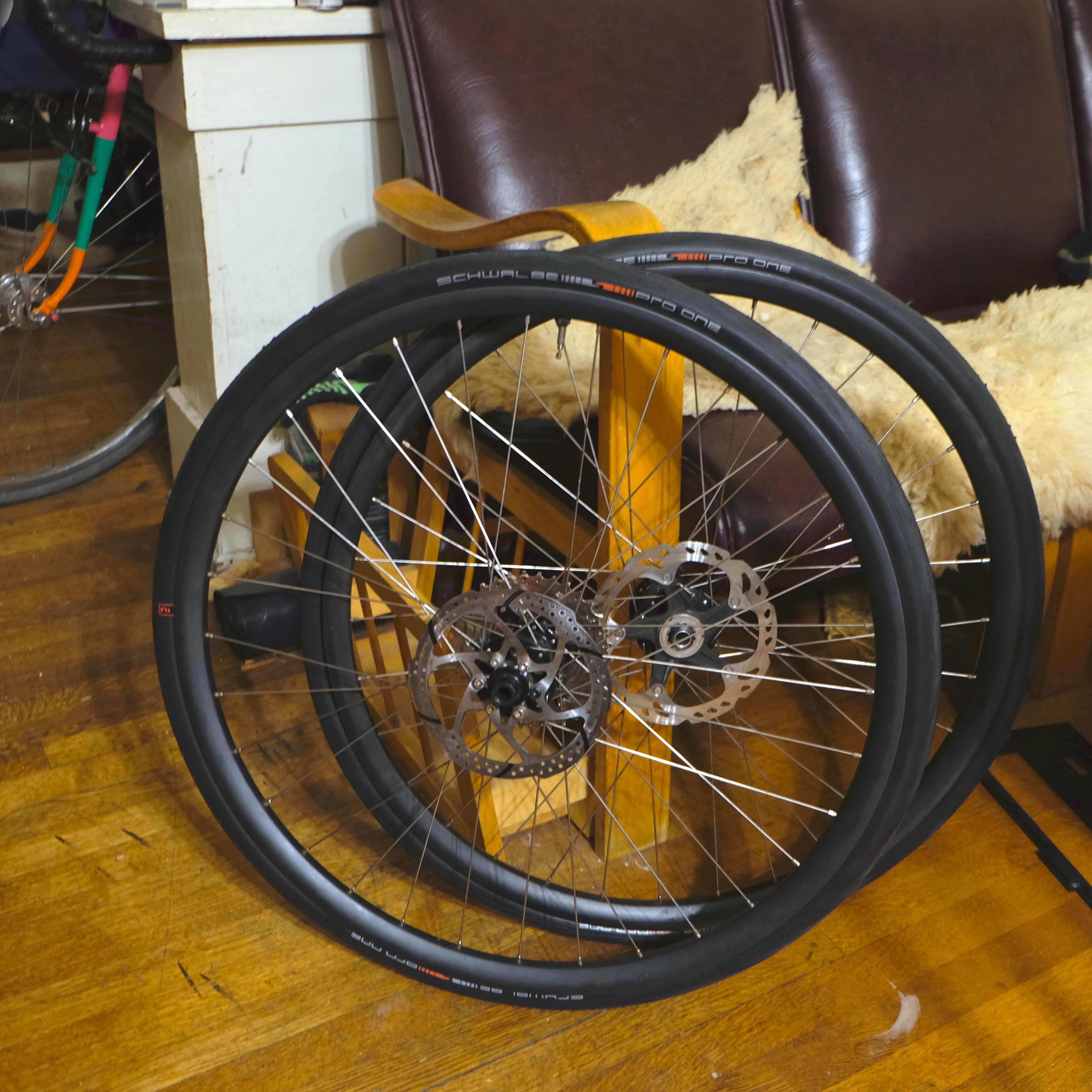 I de-gravel king’ed my carbon fiber wheelset (I needed to chase the tape because the front wheel was not holding air and a spokehead had popped off on the rear wheel) and put on a pair of 28mm Pro Ones. I couldn’t find any of my CO2 heads so I had to try a floor pump, which, shockingly (to me) actually worked at filling the tires and popping (most of) the beads onto their shelves.