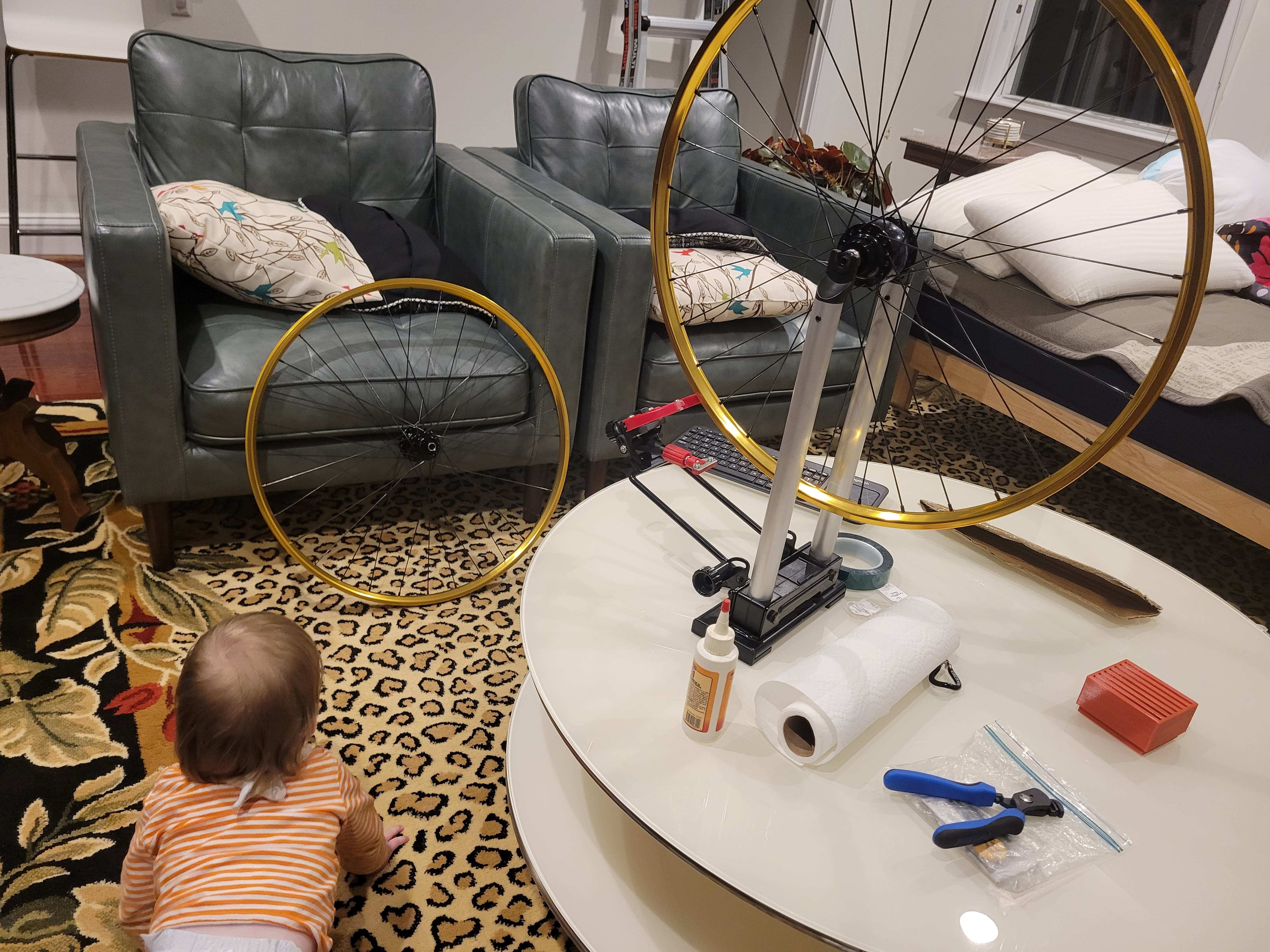 The air didn’t actually stay in the tires, due to my not using tire goo, but baby steps. Maybe this will be enough to get off my butt to glue up my 650b skinny tire travel bike?