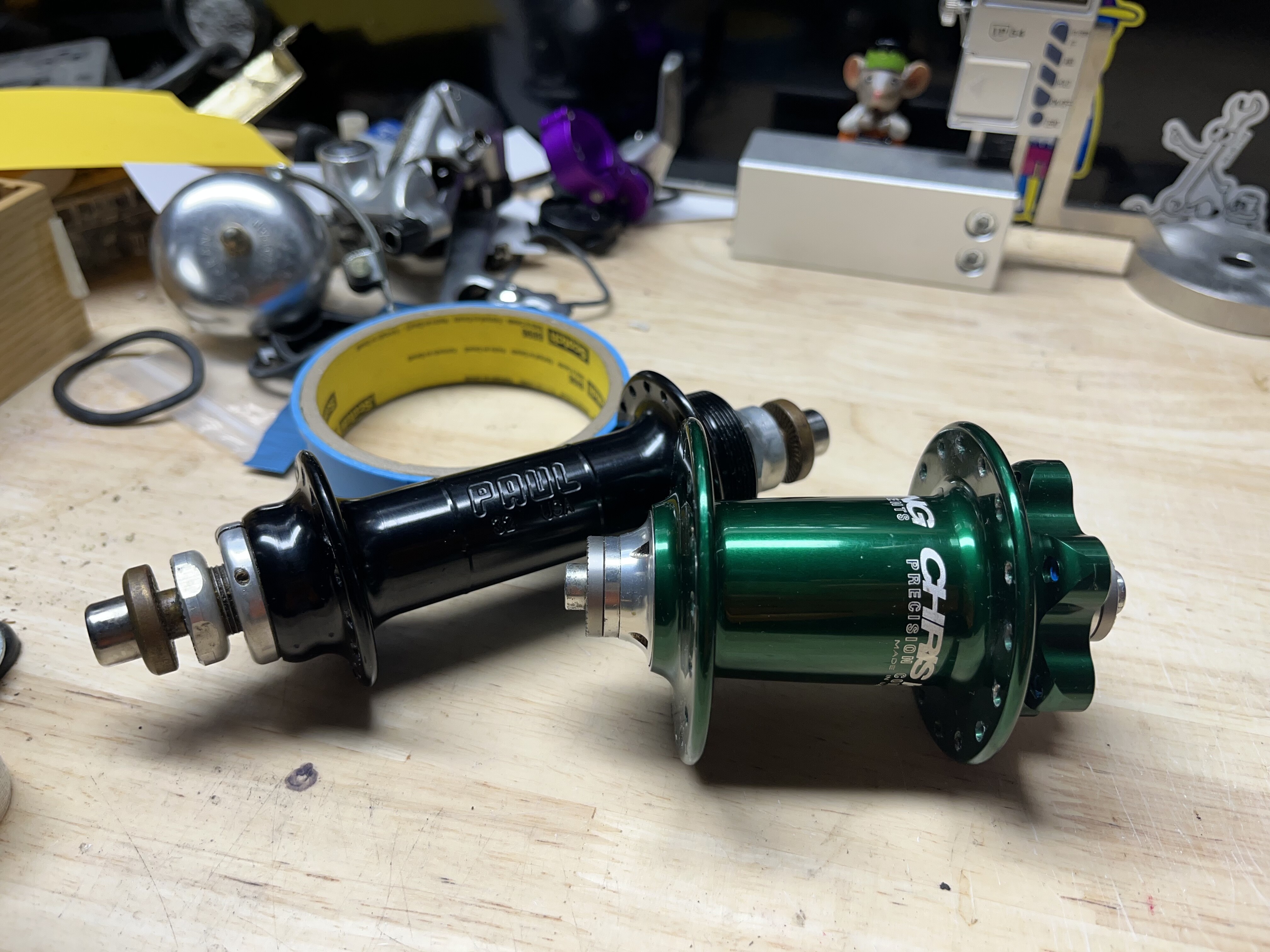 I de-built two old wheels that were deep in a closet. I totally forgot that I had these fancy hubs gathering dust! The hoard provides! Maybe the 1x1 should be a mullet.