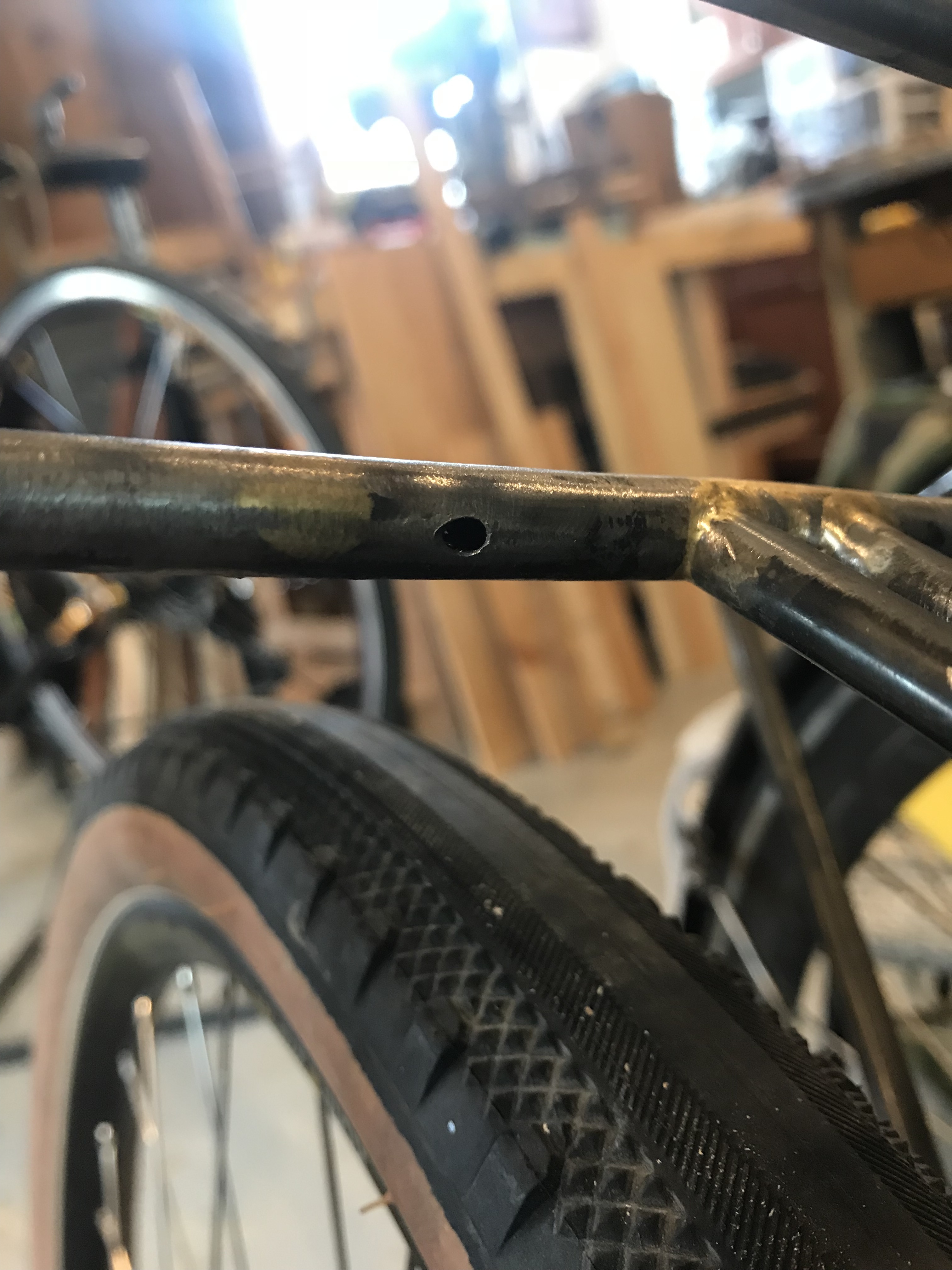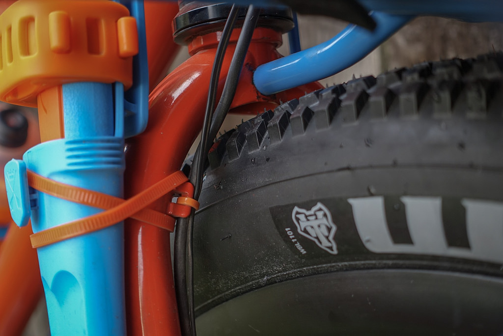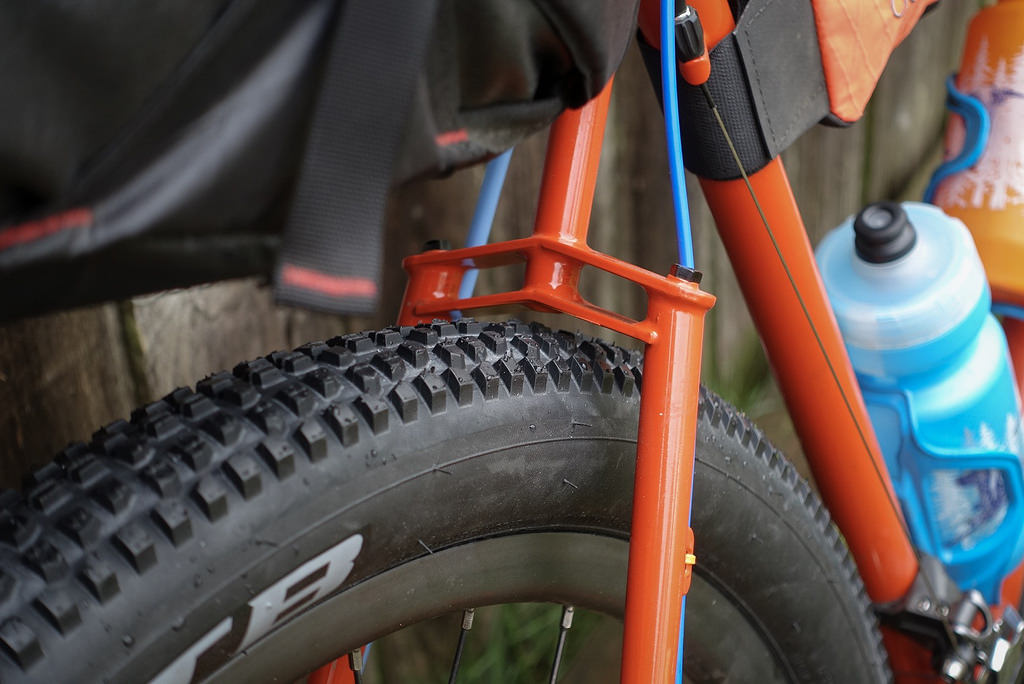 I don’t have a real MTB so decided to take the fenders off my Elephant for the first time ever. Had a pile of unused 27.5 MTB tires that I got for free a long time ago so went big for the first attempt. WTB Bee Line 2.2" barely cleared the fork, 3rd waterbottle, pusher in small chainring & bridges.