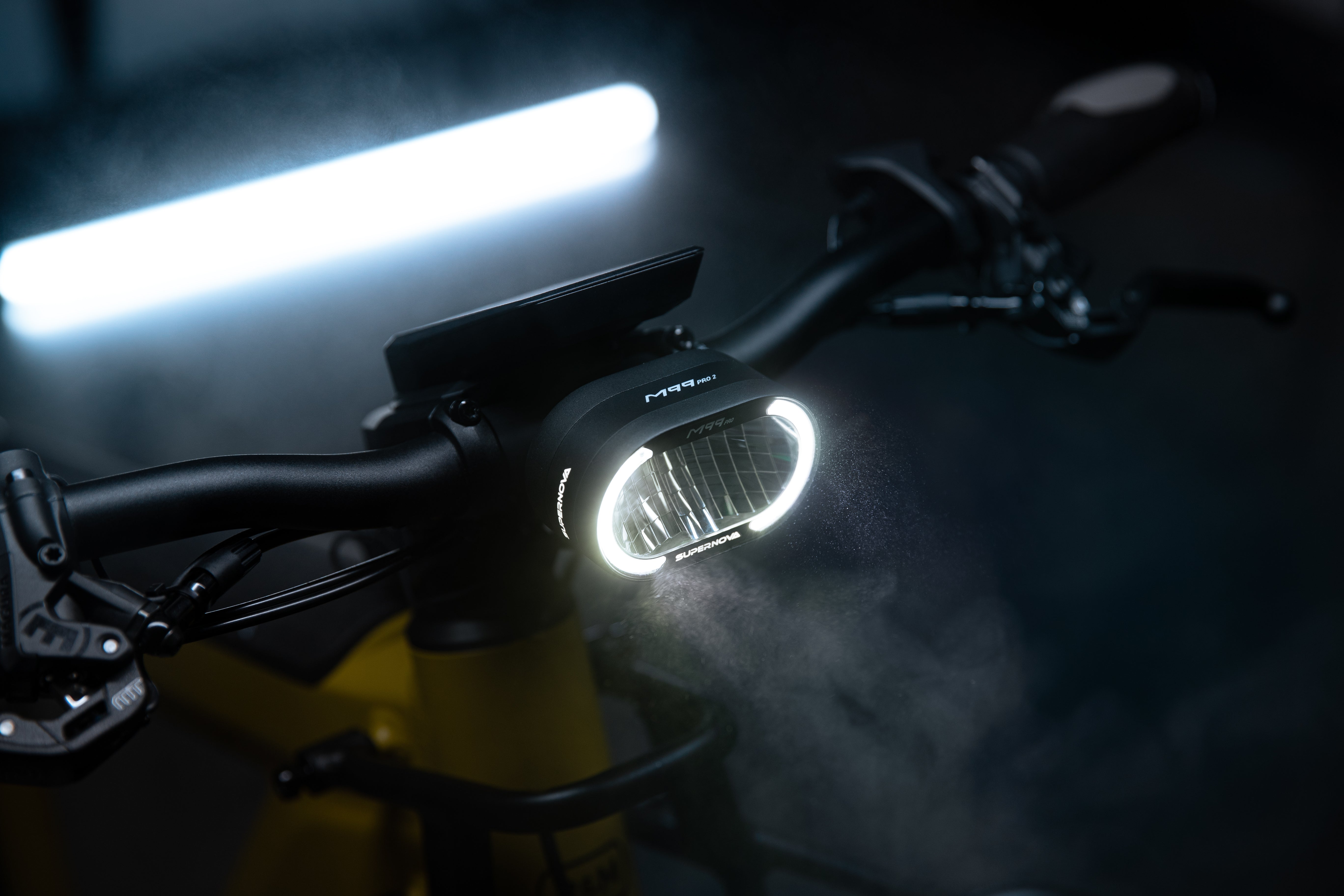 Spacing for rear rack lights is 50mm, that supernova looks narrower to me. Also the wire is in the way.