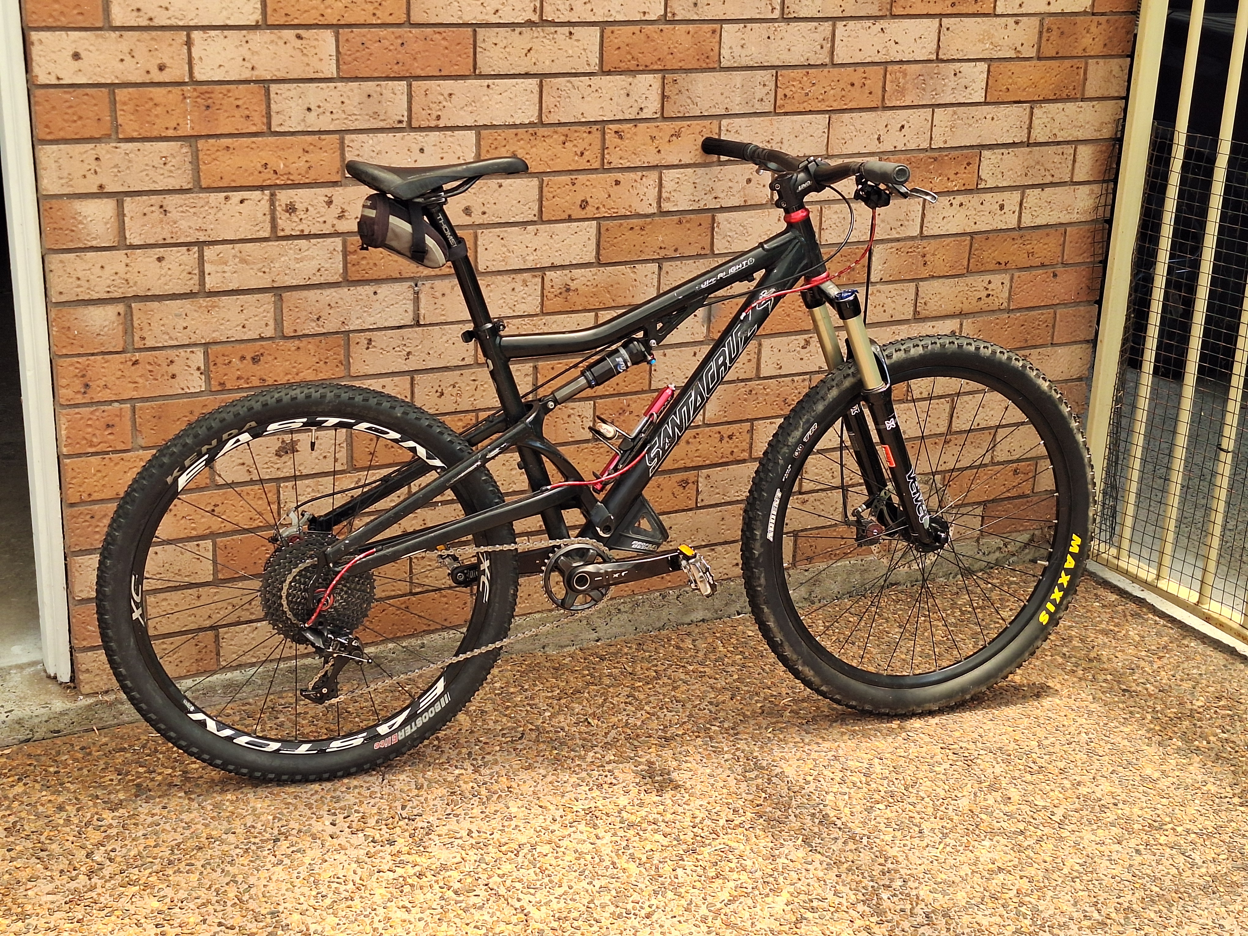 Swapped the front wheel on my “Central coast loaner bike” Santa Cruz Superlight to a 27.5 wheel I brought over from NZ. Its compatible with the Fusion fork. Swapped the rear wheel out for another wheel i brought over from NZ. The current rear wheel was a bit lightweight and the SILs raw meatatarian brother is coming over soon and he weighs 100 + kgs. He will probably use it a bit, even tho its only a medium. Also brought over a set back post to replace the lightweight Easton one it was using. Bumped up the air pressure in front and rear shocks for a 100 kg pay load. Swapped out the rear BB7 for an older one as the one it had installed had a problem with ejecting one of the pads.
