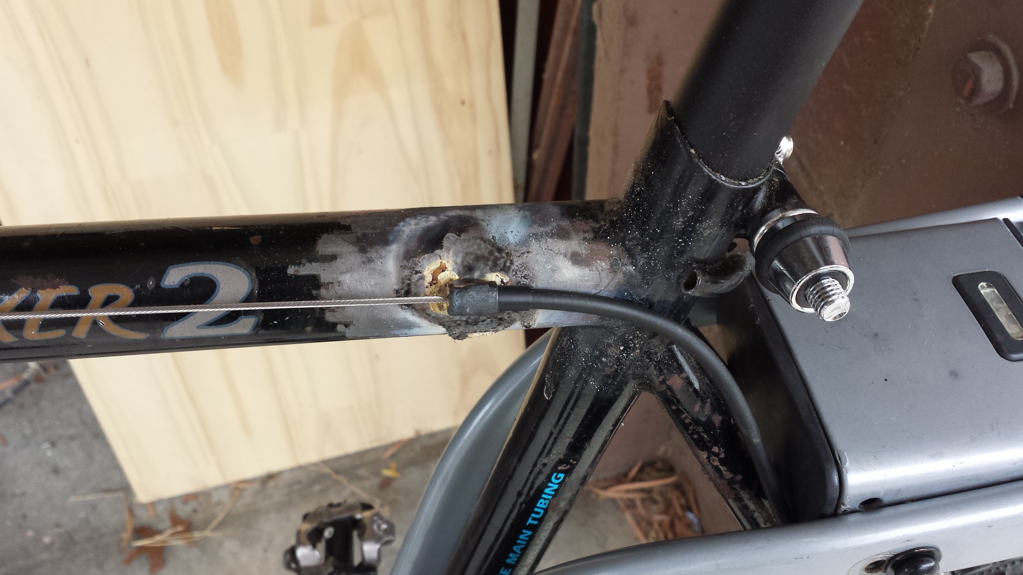 Hastily glued a cable stop to a canti frame I found on the footpath some time ago.