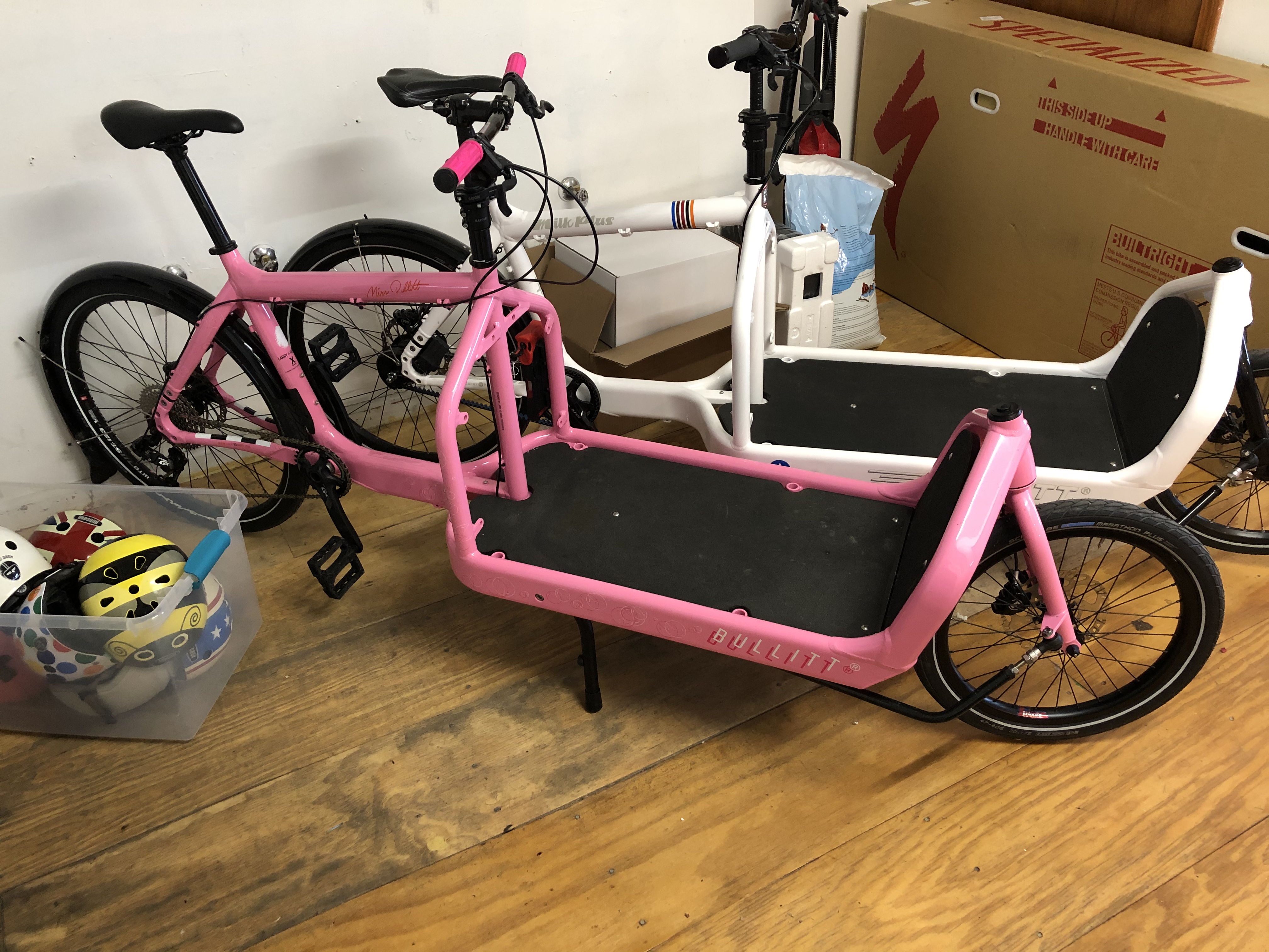 My favorite is the pink Bulitt(obviously). The Urban Arrow is a hundred pound monstrosity that rides like a truck rather than a bicycle. I think I prefer the Bulitt because yeah, itās a bike. The UA is something else entirely. Pretty fun to effortlessly push a hundred pound machine with studded tires north of 20mph though.