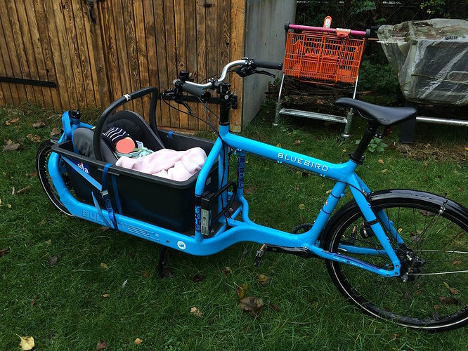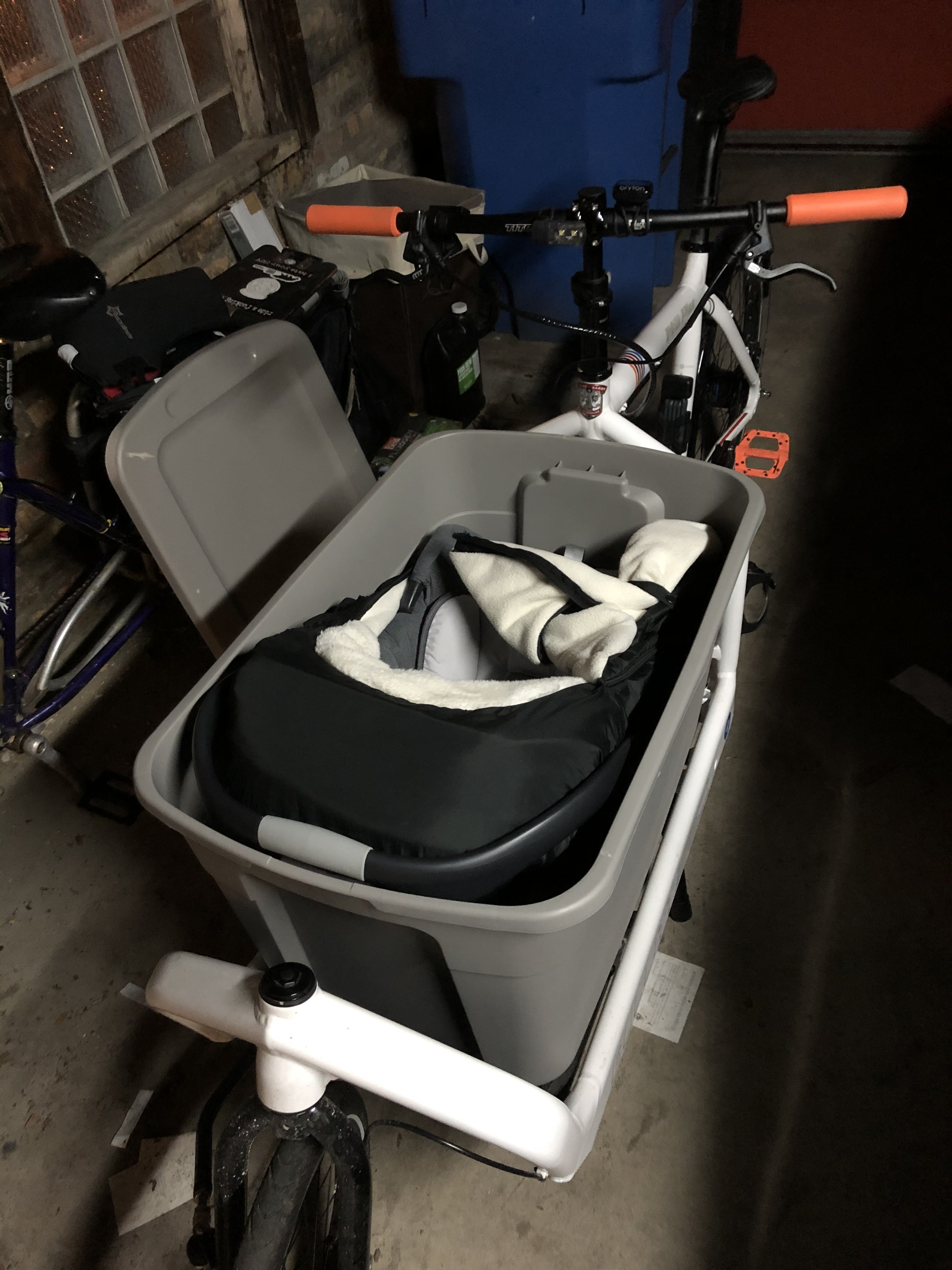 We used a similar setup, but our infant car seat was a hand-me-down from before those sweet hot-swappable bases. The seat fit perfectly in the tub so I just used straps to secure seat to the bike frame (they aren’t tensioned in the photo)